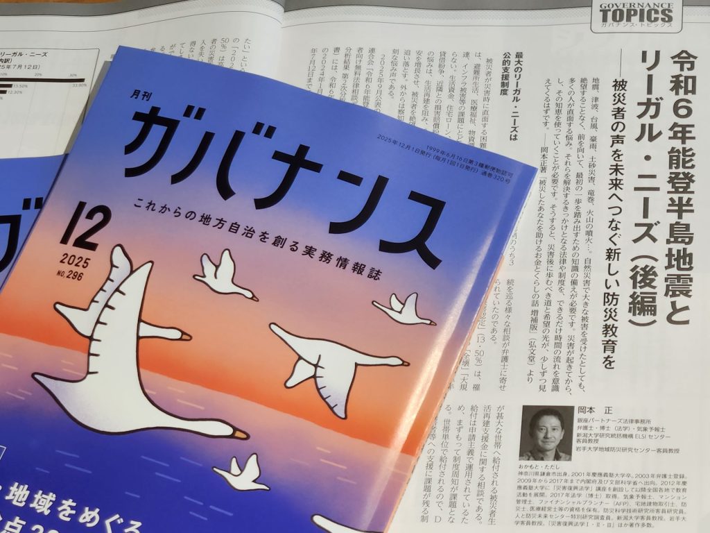 岡本正「令和6年能登半島地震とリーガル・ニーズ(後編)-被災者の声を未来へつなぐ新しい防災教育を」ぎょうせい 月刊ガバナンス No.296(2025年12月1日) pp.108-109