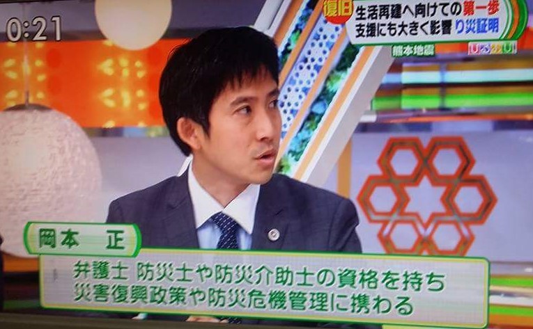 201605022016年5月2日 TBS「ひるおび!」の特集コーナー「ゴゴイチ」に岡本正がスタジオ出演しました。熊本地震に関連して、罹災証明書や被災者生活再建支援金などの各種生活再にかかわる制度を解説しました(司会:恵俊彰、八代英輝 アナウンサー:江藤愛、杉山真也 コメンテーター:三雲孝江、竹内薫、ゲスト:山村武彦、岡本正)