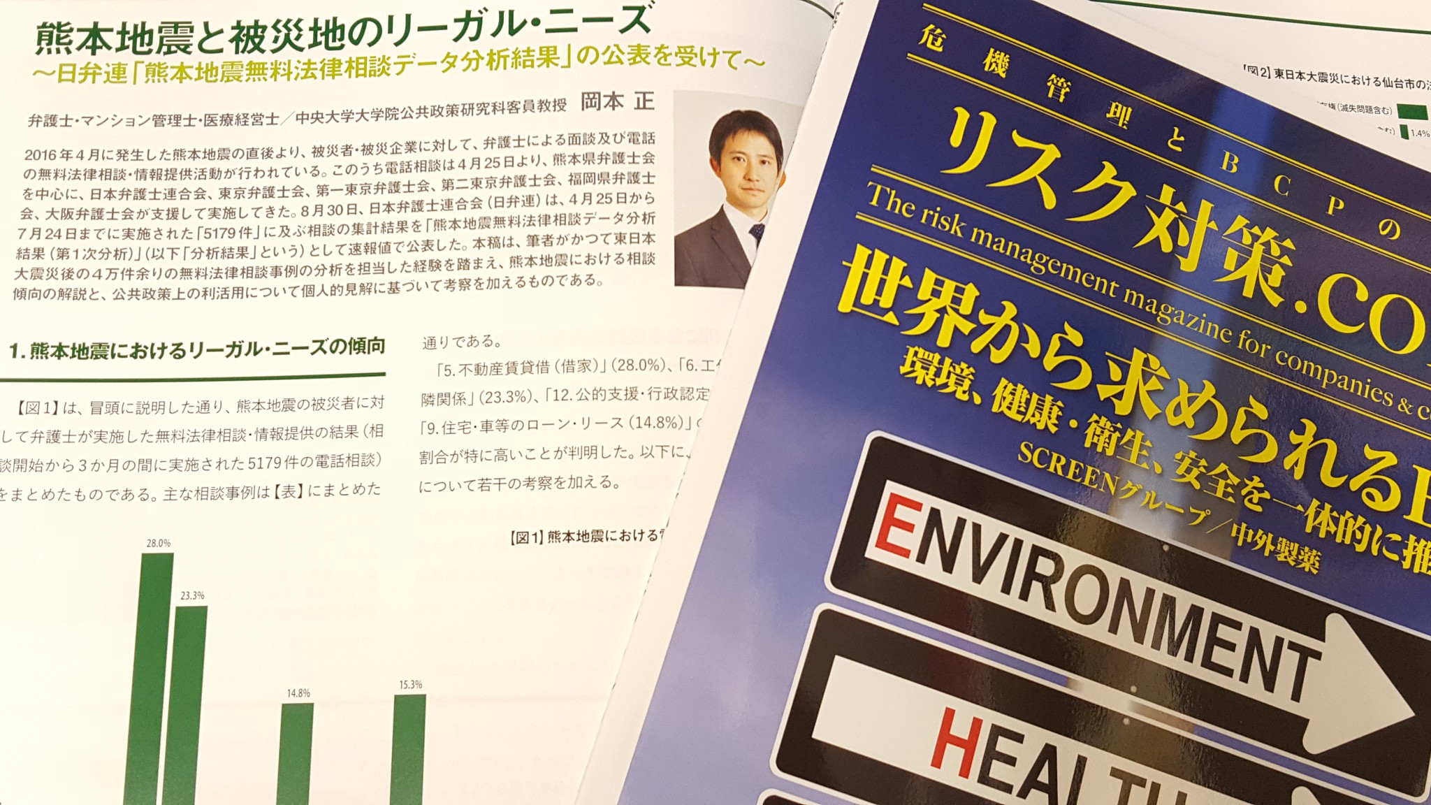「危機管理とBCPの専門誌 リスク対策.com」(vol.57 2016年9月25日発刊 70-73頁) に岡本正「熊本地震と被災地のリーガル・ニーズ~日弁連『熊本地震無料法律相談データ分析結果』の公表を受けて~」が掲載されました。>2016年10月6日にウェブ公開もされました(リスク対策.com)