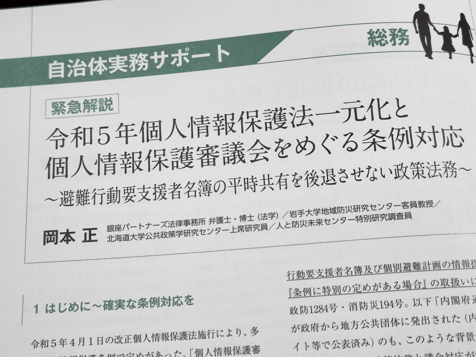 岡本正「令和5年個人情報保護法一元化と個人情報保護審議会を巡る条例対応~避難行動要支援者名簿の平時共有を後退させない政策法務」『自治実務セミナー』2022年12月号 34-39頁(自治体実務サポート・総務/緊急解説)第一法規