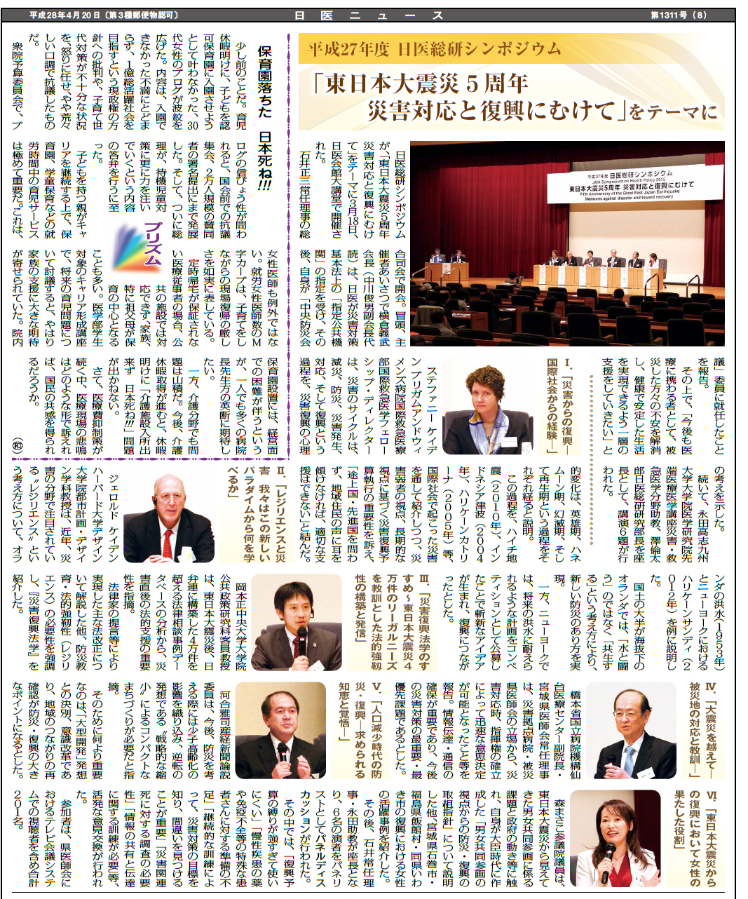 【メディア記事】(日医ニュース)「「東日本大震災5周年 災害対応と復興にむけて」をテーマに平成27年度 日医総研シンポジウム」[ 2016年4月20日 ]