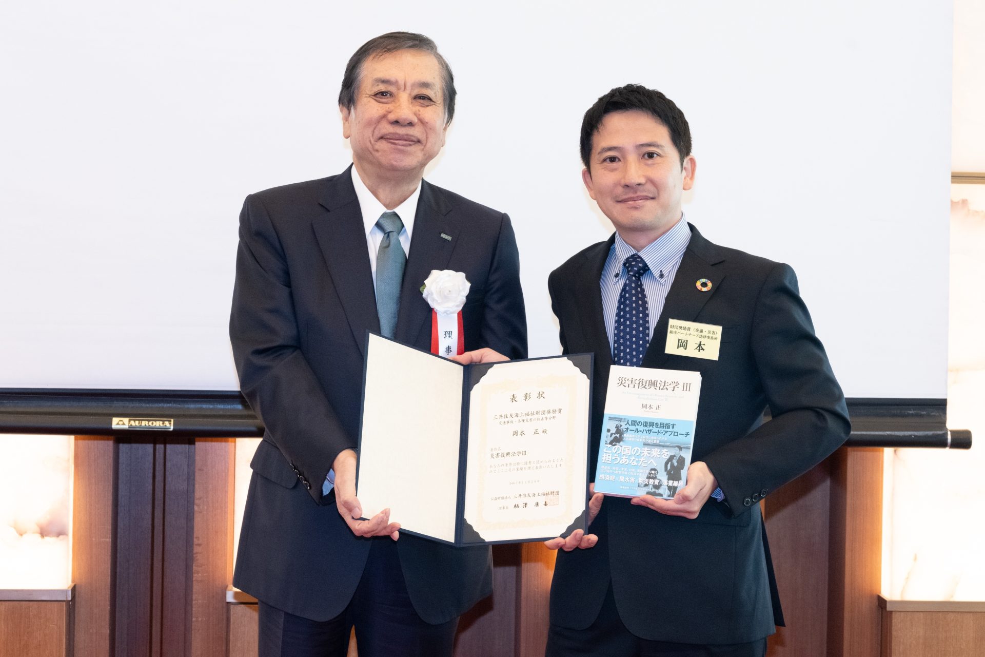 岡本正の著作『災害復興法学Ⅲ』(2023年 慶應義塾大学出版会)が「交通事故・各種災害の防止等分野」の分野において「三井住友福祉財団奨励賞」を受賞しました。贈呈式では、柄澤康喜・三井住友海上福祉財団理事長(三井住友海上火災保険株式会社常任顧問)より表彰状を授与いただきました。また、来賓には、南順子・大臣官房審議官(共生・共助担当)をはじめ、各界の重鎮の皆様がご参列されました。