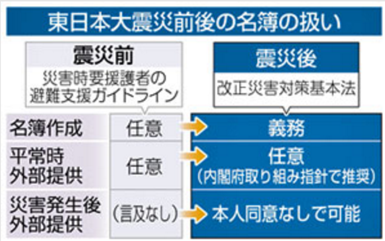 >「東京を拠点に活動する弁護士の岡本正氏は、自治体から支援団体へ個人情報を提供するのが条例上難しいとされていることに触れ、東日本大震災時を例に「提供できるよう解釈を広げたり、平常時から情報共有できる条例を作っている自治体もある。平常時から取り組んでいる所は災害に強い」と訴えた。」