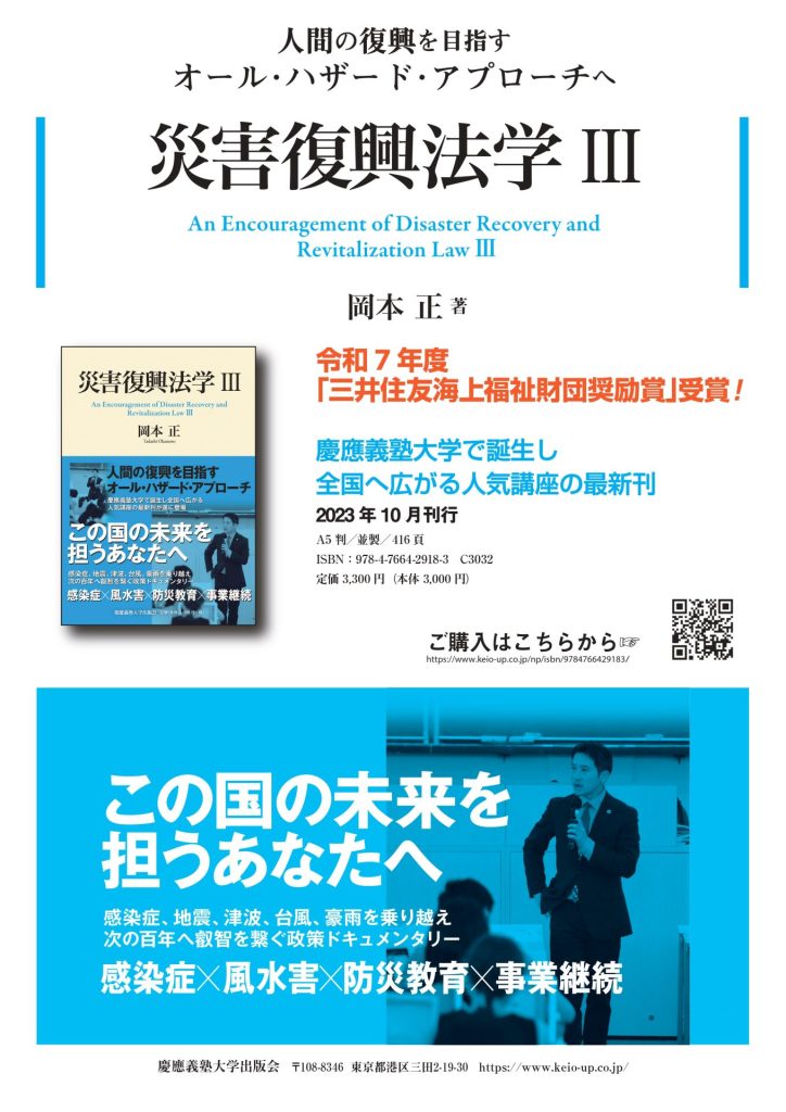 岡本正著『災害復興法学Ⅲ』(慶應義塾大学出版会 2023年)は『令和7年度 三井住友海上福祉財団 奨励賞』(交通事故・各種災害の防止等分野)を受賞しました(令和7年10月24日付)。本書をご推薦・ご選出いただいた先生方、これまでご指導頂いた先生方、切磋琢磨してきた仲間たち、書籍を世にだしてくださった出版社の皆様、そして家族の支えがあってのことと心より感謝を申し上げます。