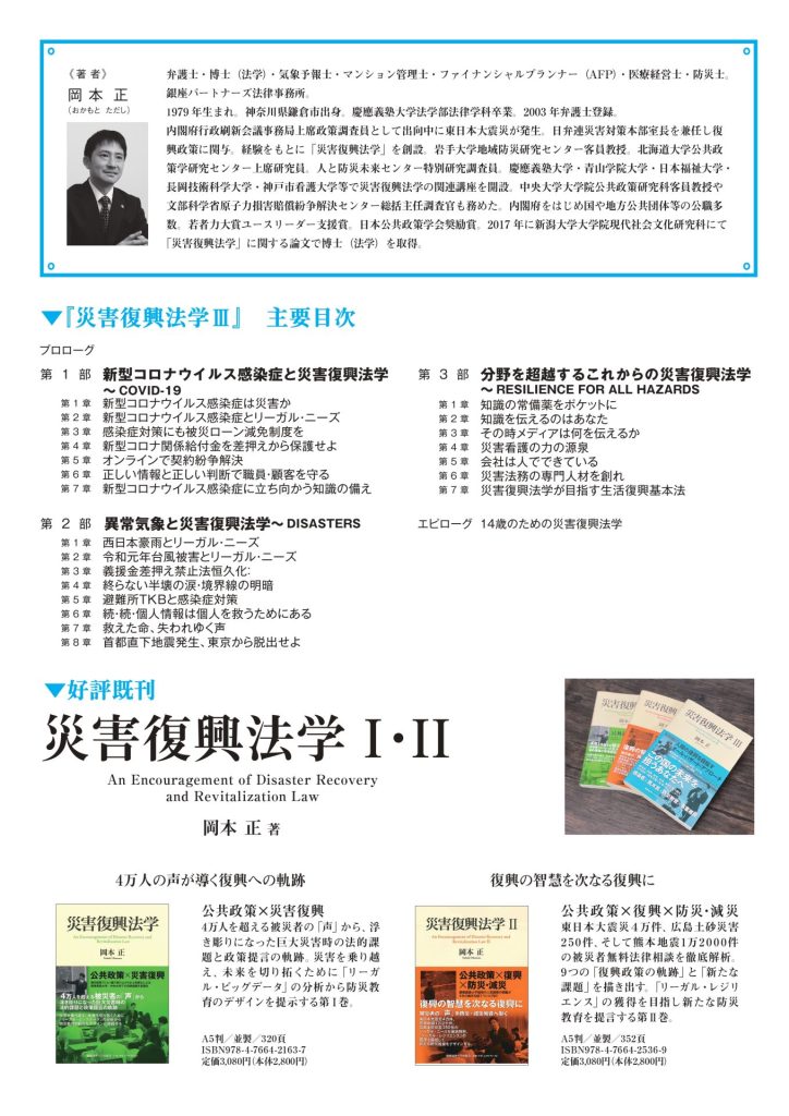 2014年に出版した自身初の単著である『災害復興法学』のシリーズ3巻目となる本作は、自然災害と感染症禍の声を分析し、その共通点を示し、生活復興段階のオールハザードアプローチによる社会脆弱性克服を目指して執筆にあたりました。防災、法律、福祉、医学等の多様な分野を巻き込み、生活再建、経済復興、社会的健康(ソーシャルウェルビーイング)を達成する法制度の構築を提言しています。