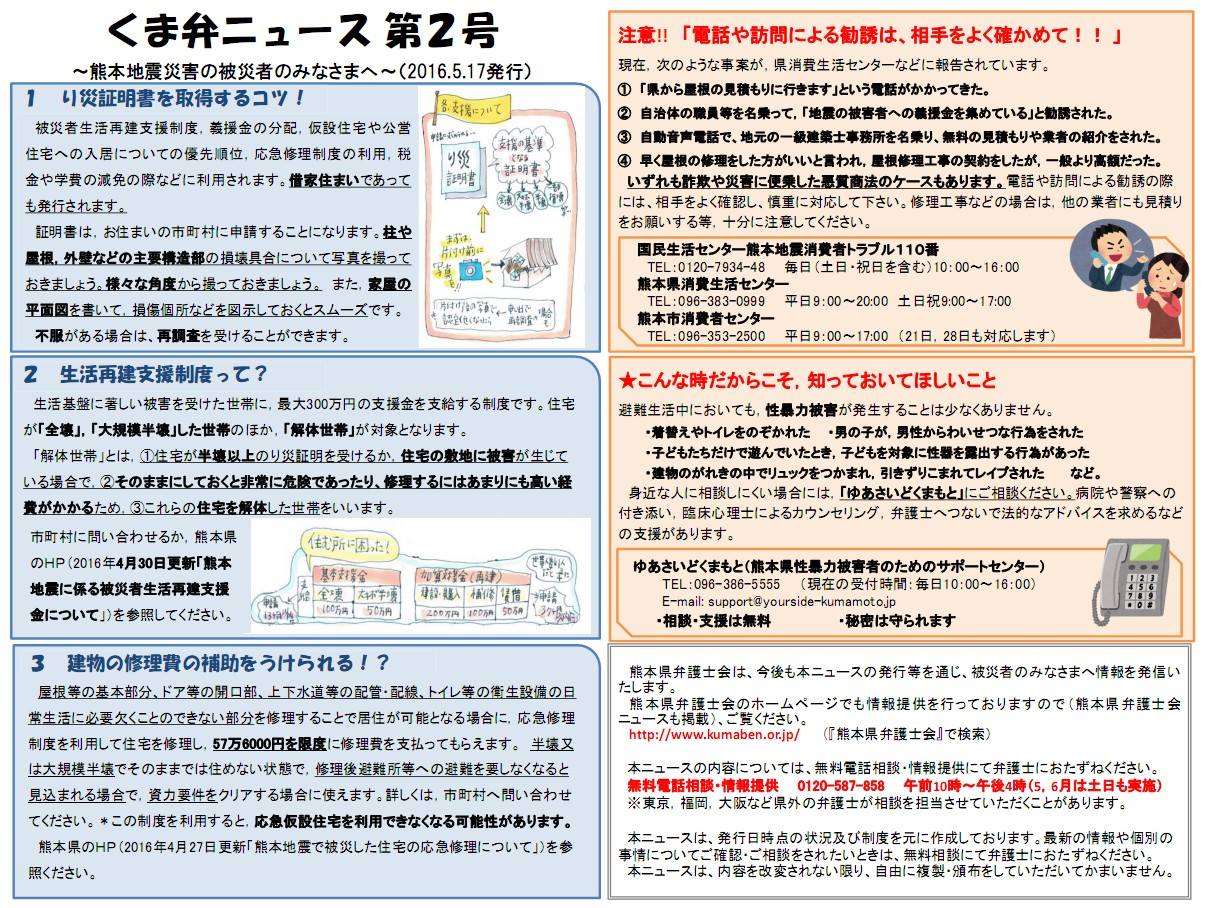 ➡くま弁ニュース第2号(熊本県弁護士会ニュース 第2弾 2016年5月17日版)