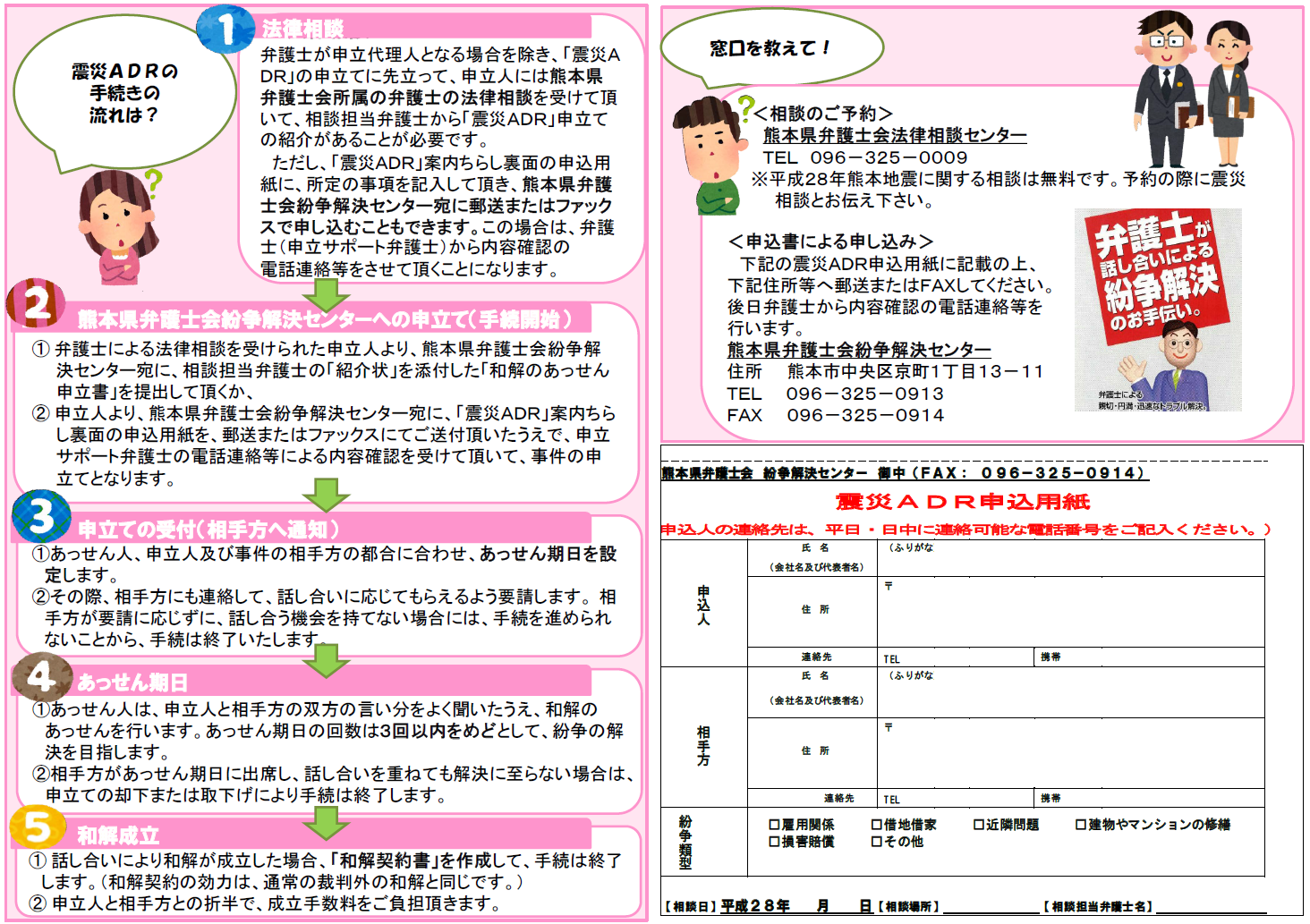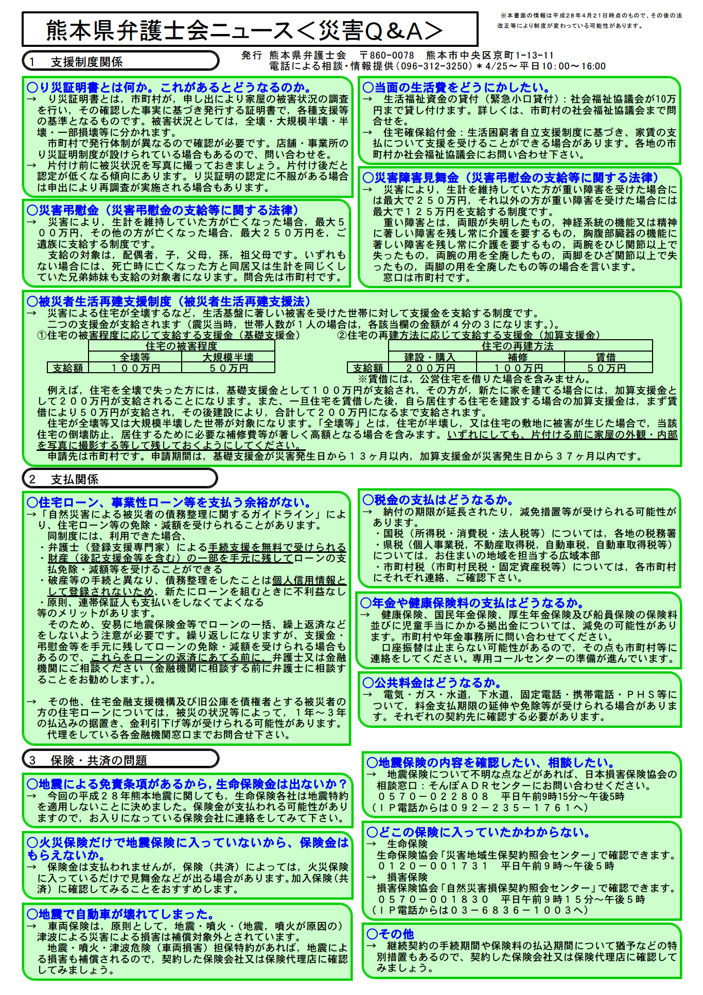 熊本県弁護士会が被災者・被災企業の再建情報をまとめたニュース(表裏1枚のコンパクトなもの)です。過去の災害支援経験をもとに、災害時の被災された方のニーズをまとめています。法律や情報は発行時点のものであり、今後変わる可能性がありますので留意ください。「まずはどうしたらいいのか?」「当面の生活費は?」「どこに行けばいいのか?」「ローンや料金の支払いは?」。そのような問いに対して、完璧ではありませんが、少しでもお答えし、希望をもっていただけたらと願い作成されたものです。行政・民間問わず、被災された方や組織、支援に入る行政・企業の方、遠方から思いを寄せる方、是非ご一読いただければと思います。もし印刷・配布くださる場合は、カラー印刷をお願いできればと思います。