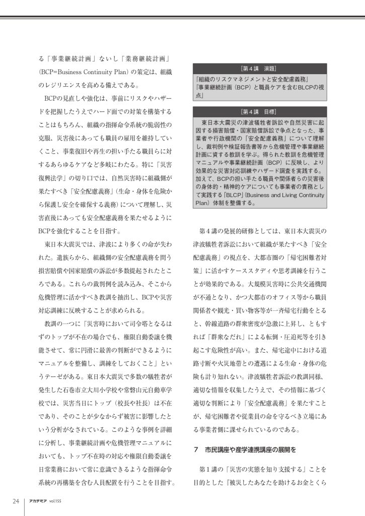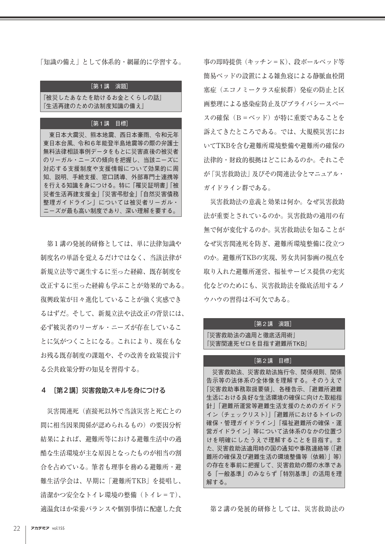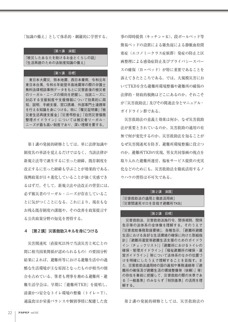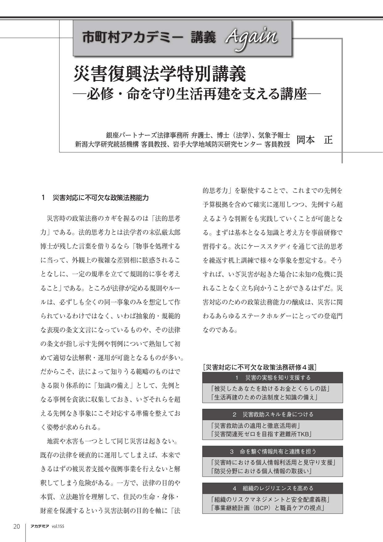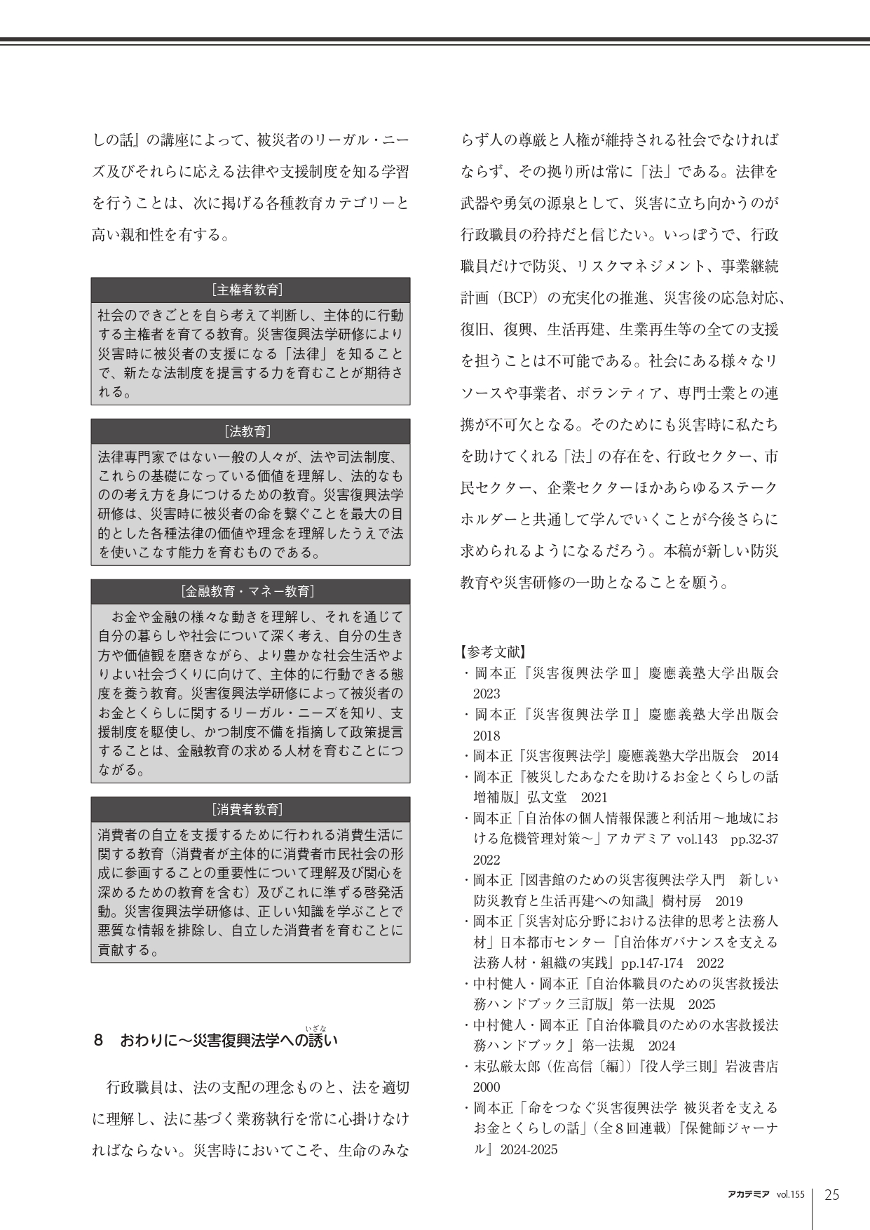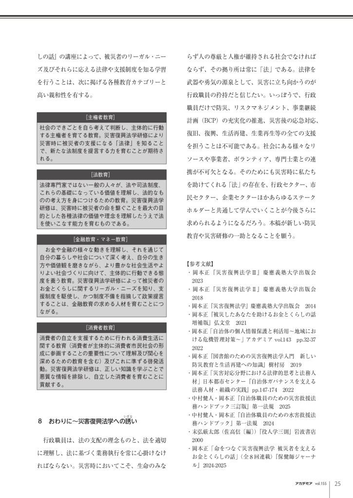 岡本正「災害復興法学特別講義─必修・命を守り生活再建を支える講座─」アカデミア 第155号(2025年10月) pp.20-25