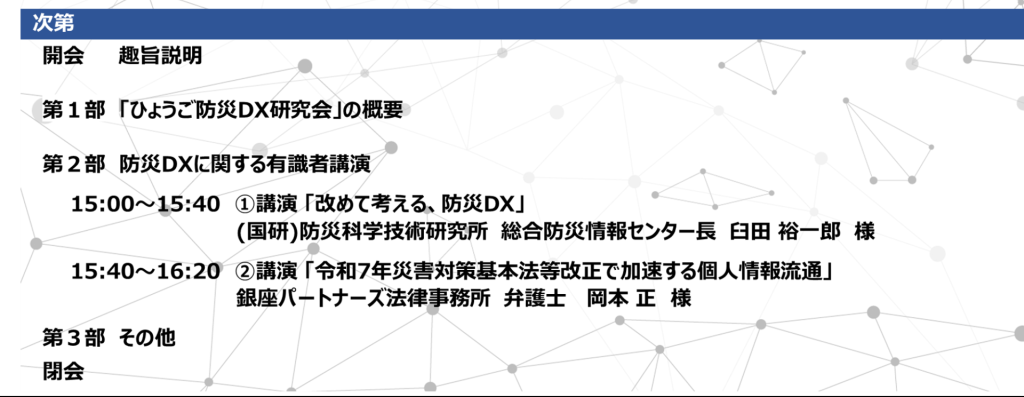 ホーム > 活動実績 > 【講演】(兵庫県ひょうご防災DX研究会)「令和7年災害対策基本法等改正で加速する個人情報流通」