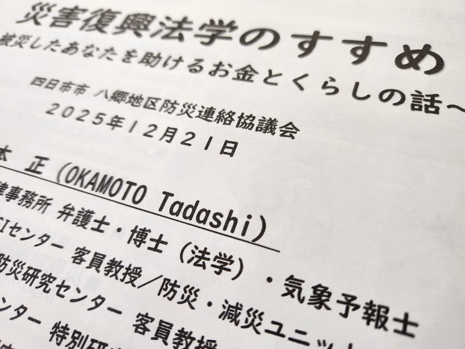 【講演】(四日市八郷地区防災連絡協議会)「災害復興法学のすすめ~被災したあなたを助けるお金とくらしの話」