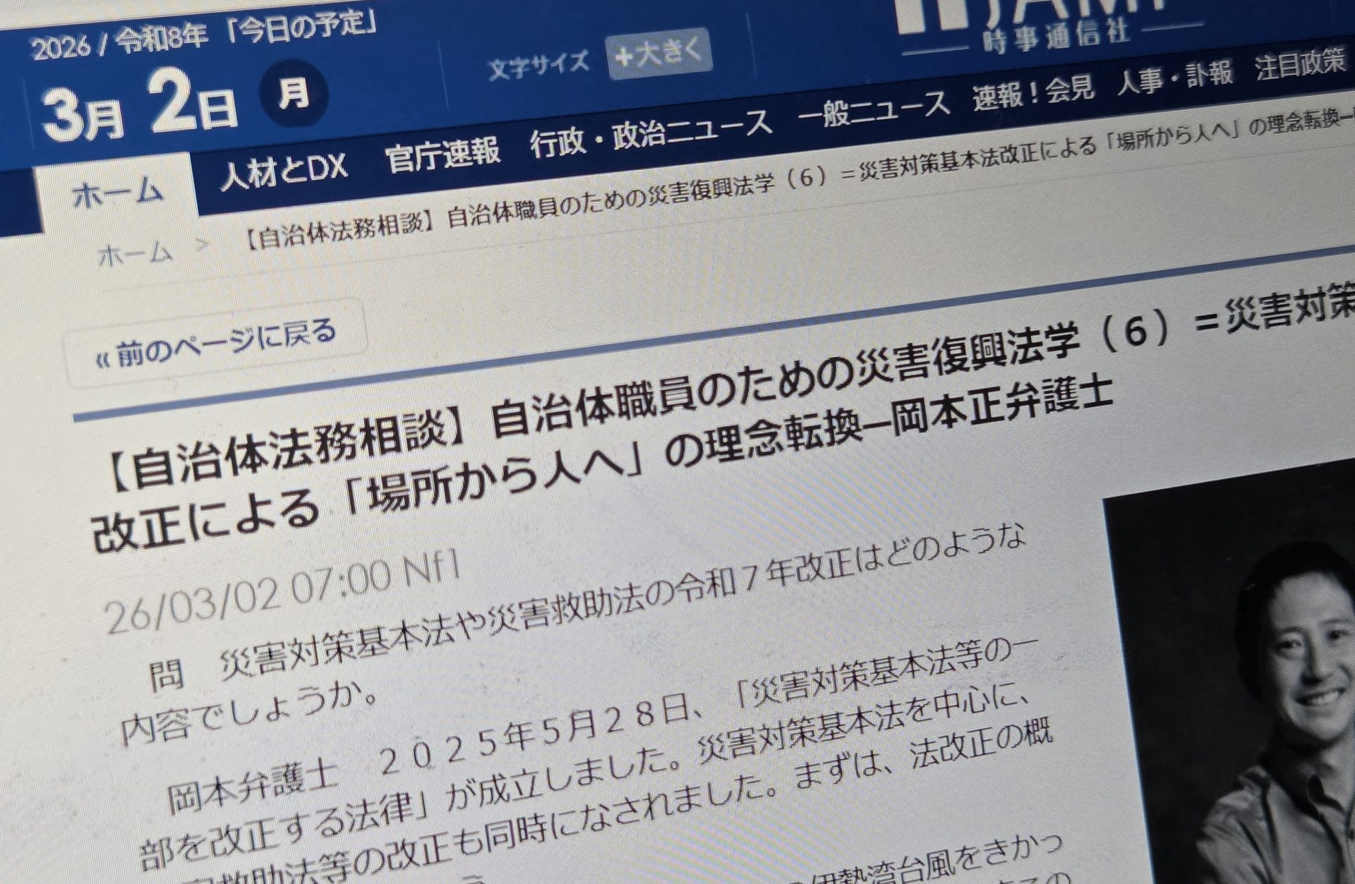 ホーム > 活動実績 > 【メディア連載】(時事通信社 iJAMP)「【自治体法務相談】自治体職員のための災害復興法学(6)=災害対策基本法改正による「場所から人へ」の理念転換―岡本正弁護士」