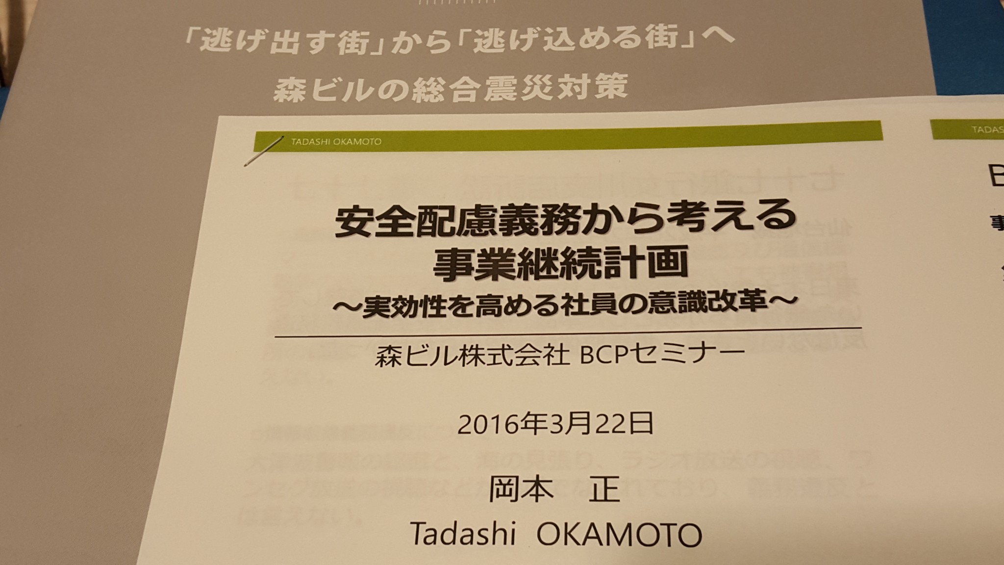 2016年3月22日 六本木ヒルズ森タワー・アカデミーヒルズ 森ビル株式会社主催のBCPセミナーにて、岡本正が講演をしました。演題は「安全配慮義務から考える事業継続計画~実行性を高める社員の意識改革~」です。90社余りの方々にご参加いただきました。感謝申し上げます。津波犠牲者訴訟の教訓からBCPの本質を捉えるポイントをお話ししたのち、被災と生活再建のリアルなニーズ・声、そして、対応する支援制度などを東日本大震災4万件の声をベースに紹介しました。