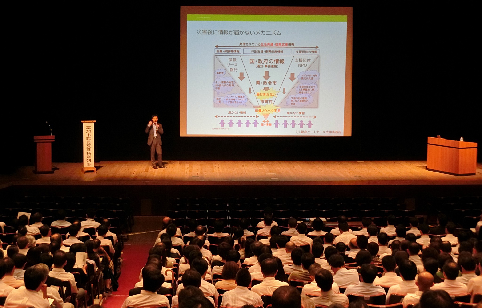 2016年7月21日 草加市全管理職対象夏期研修「知恵の備えによる災害に強い市役所づくり」(草加市文化会館)/岡本正「『防災を自分ごとに』 災害復興法学のすすめ ~住民ニーズに応える情報提供支援 災害救助法の徹底活用」