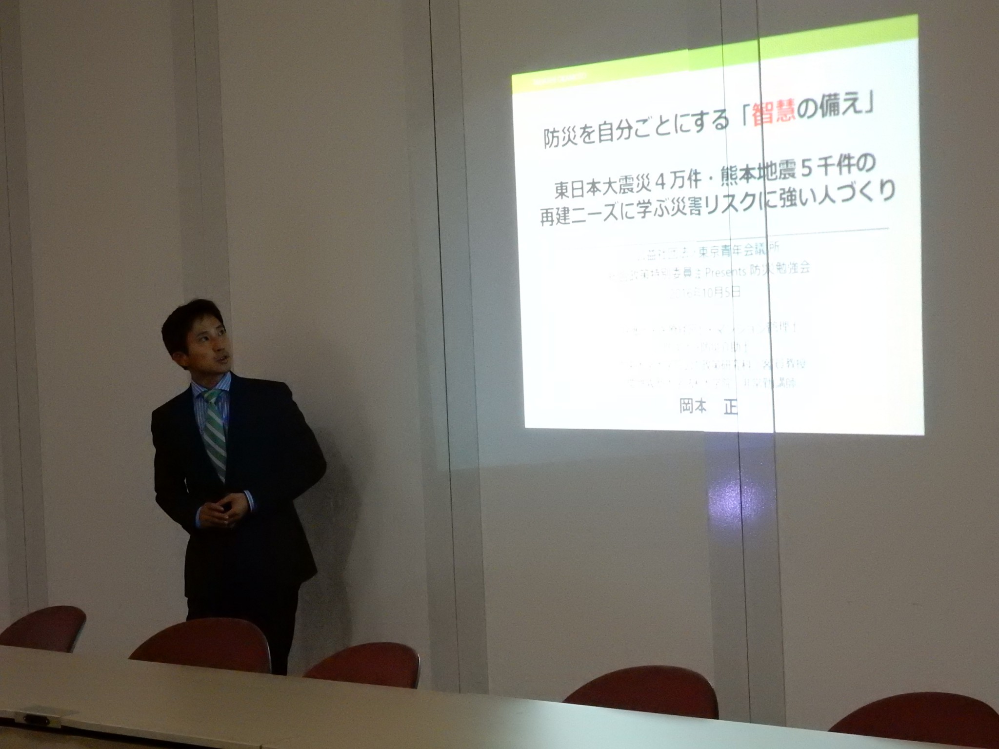 2016年10月5日 公益社団法人東京青年会議所 (東京JC) 総合政策特別委員会 Presents 防災勉強会(青年会議所会館)/講師:岡本正「防災を自分ごとにする『智慧の備え』~東日本大震災4万件・熊本地震5千件の再建ニーズに学ぶ災害リスクに強い人づくり~」/組織の防災や事業継続とは、通常、災害直後に命や建物を守るための活動として行います。しかし、災害から生き残ったのち、困難となった事業や個人の生活を再建し、生き抜くためにも、悩み・紛争が起こります。「何かも失って一体なにをすればいいのか」「ローンの支払いは」「教育の支援は」「自宅再建は」。まずは、被災後の生活の困難・再建に関する等身大のリアルな声・ニーズを知ることで、災害がおきるとはどういうことかをより強く実感し、災害・防災を「自分ごと」として考えることができるのではないでしょうか。