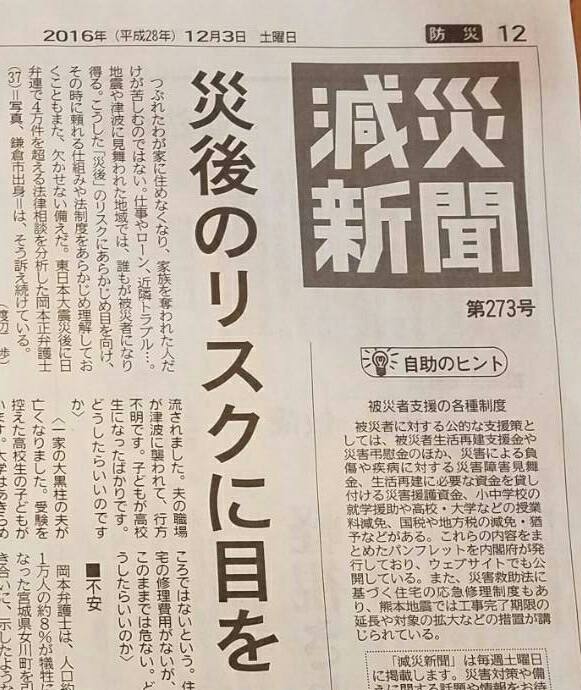 2016年11月に岡本正が鎌倉市浄明寺町内会主催の「防災の集い」にて講演した内容が神奈川新聞のコーナー「減災新聞」で記事になりました。詳細に講演が再現され、コンセプトも正確に伝えいただきました。4万件に及ぶ法律相談分析のポイントや政策提言への活用にも言及下さっています。>講演の様子はこちらです
