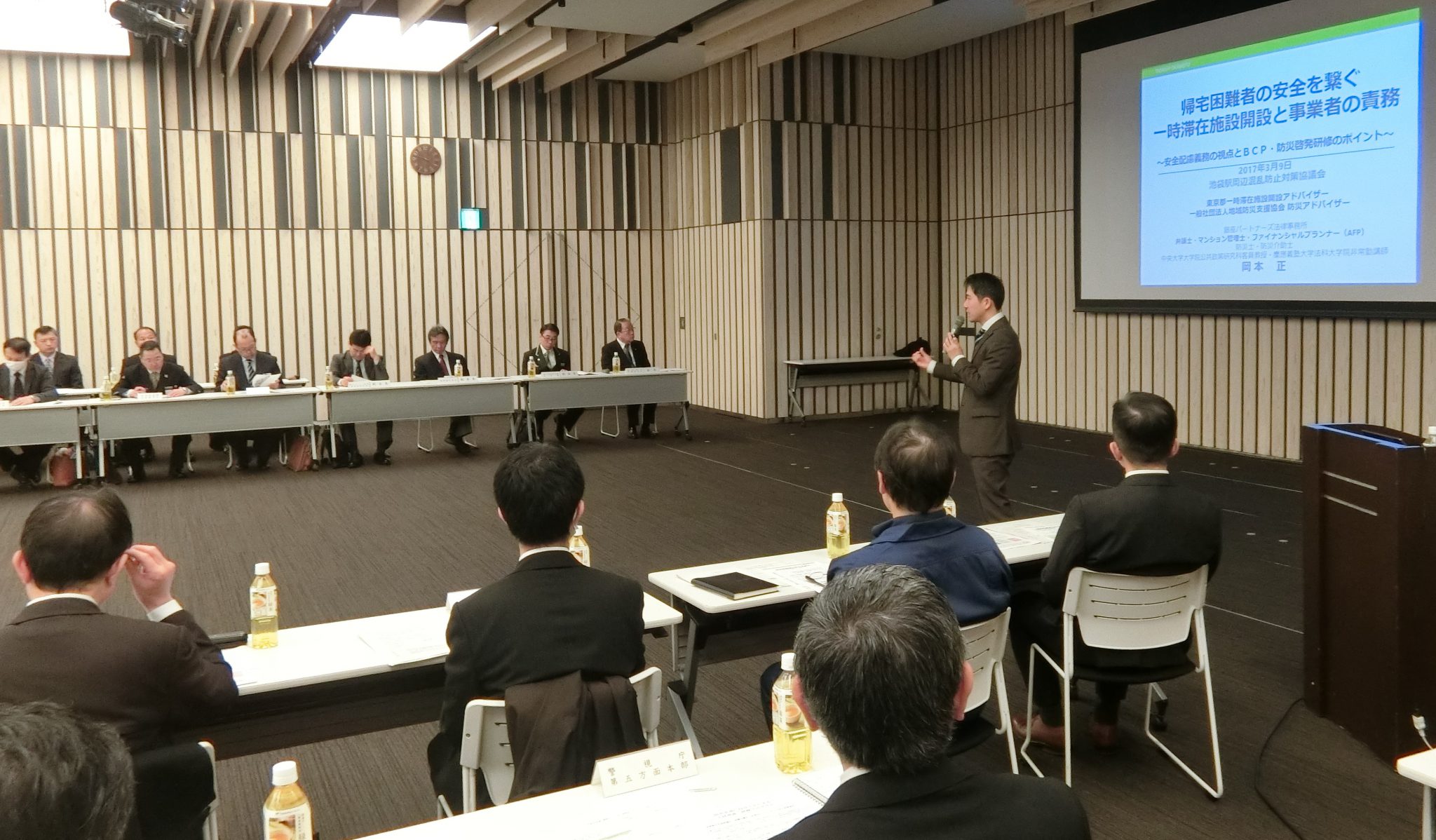 2017年3月9日「平成28年度第4回池袋駅周辺混乱防止対策協議会」(於:豊島区役所)/講演:東京都一時滞在施設開設アドバイザー・一般社団法人地域防災支援協会防災アドバイザー・岡本正「帰宅困難者の安全を繋ぐ 一時滞在施設開設と事業者の責務 ~安全配慮義務の視点とBCP・防災啓発研修のポイント~」