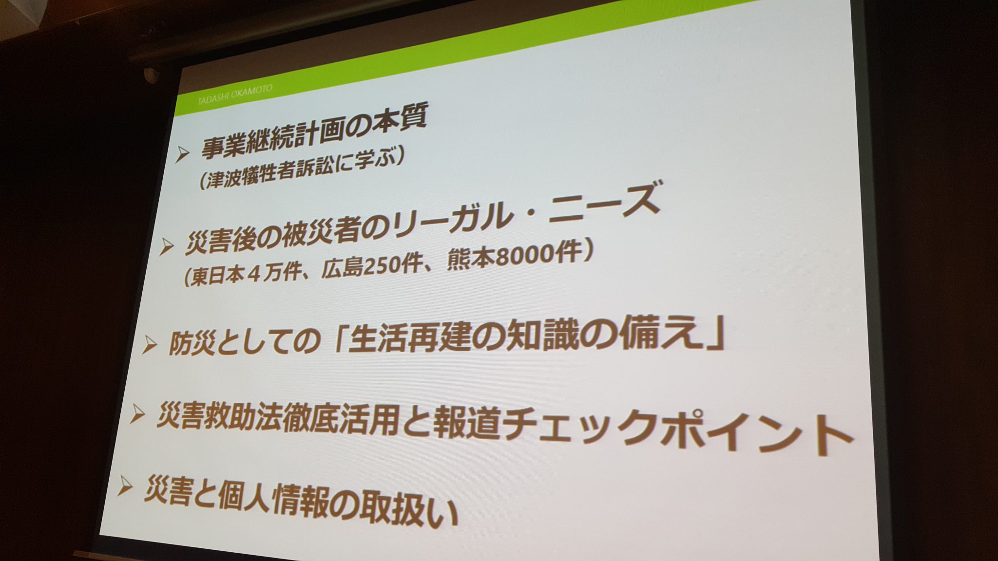 講師:岡本正「災害後の被災者のリーガルニーズと復興政策のポイント 被災者支援制度の基礎知識の備え」。NHKのデスクや記者の方々に向けて、災害後の復興政策や被災者生活再建支援の制度知識などについて勉強会講師をさせていただきました。現場を取材されている記者の皆さまと活発な討議ができ、感謝申し上げます。「事業継続計画(BCP)のポイント(津波犠牲者訴訟に学ぶ)」「災害後の被災者のリーガル・ニーズ(東日本大震災4万件、広島土砂災害、熊本地震8千件)」「生活再建制度の知識の備え・支援制度の基礎知識」「災害救助法の徹底活用と取材のポイント」「災害時における個人情報の取扱い・マンション防災の課題」をテーマに取り上げ、政策上の課題や今後の展望、現在の復興支援における注目ポイントなどをお話させていただきました。