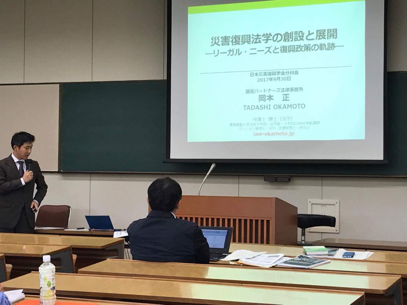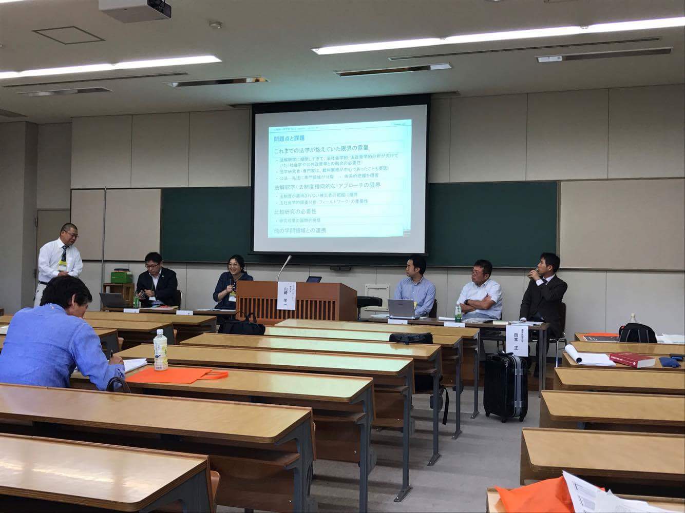 「法解釈」学の先の「公共政策」学へ、というテーマのもと活発な意見が交わされました。岡本正は「災害復興法学の創設と展開~リーガル・ニーズと復興政策の軌跡~」と題して報告を行いました。