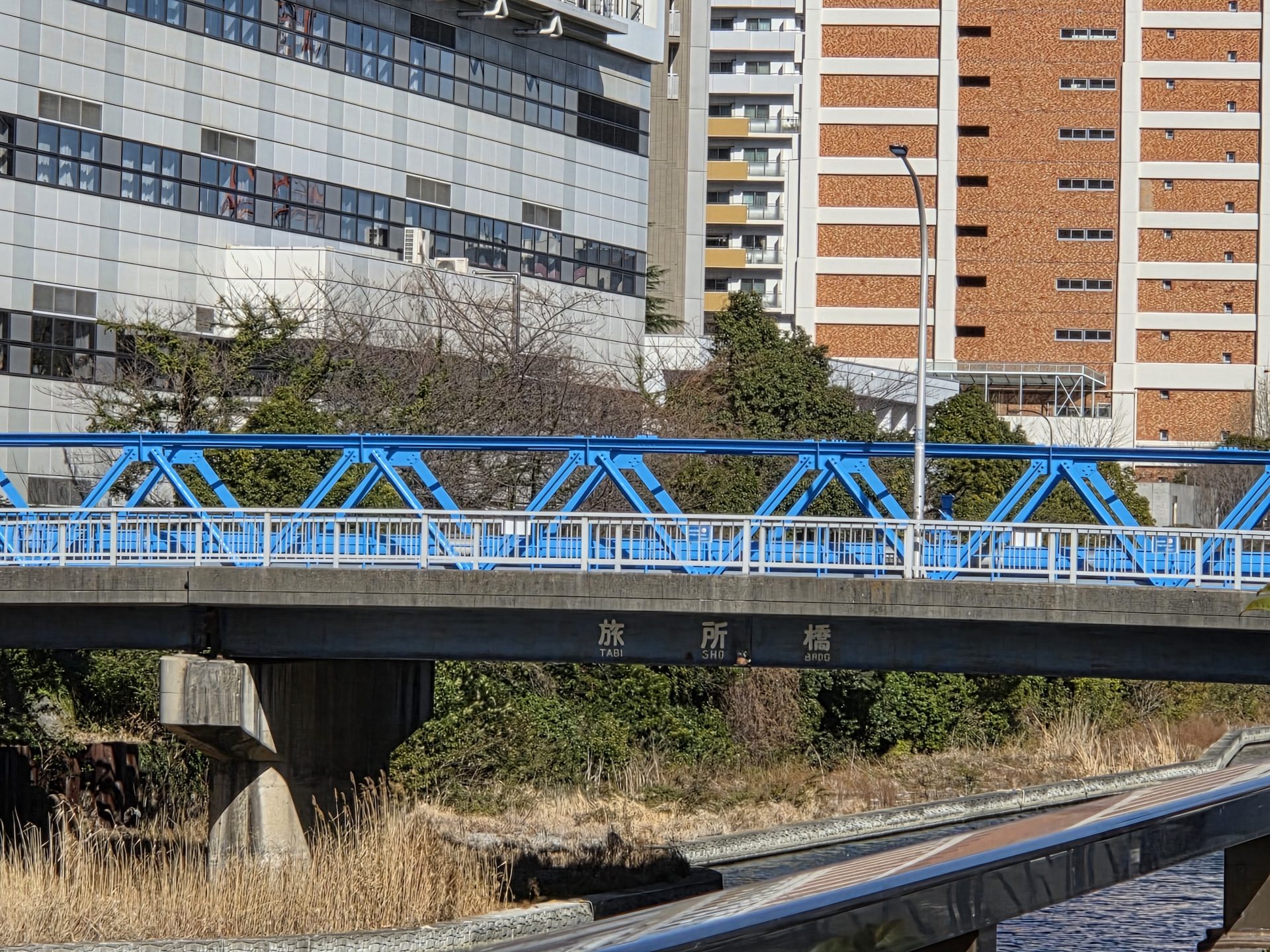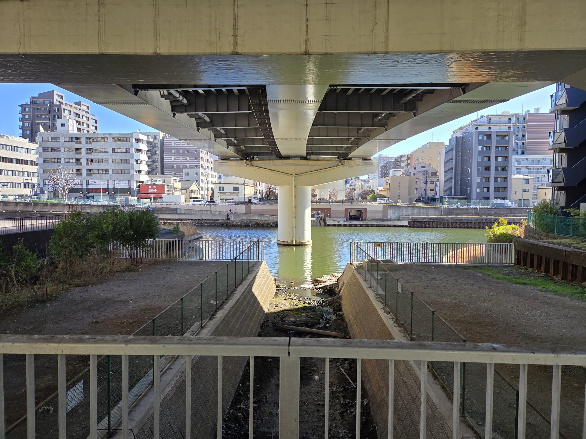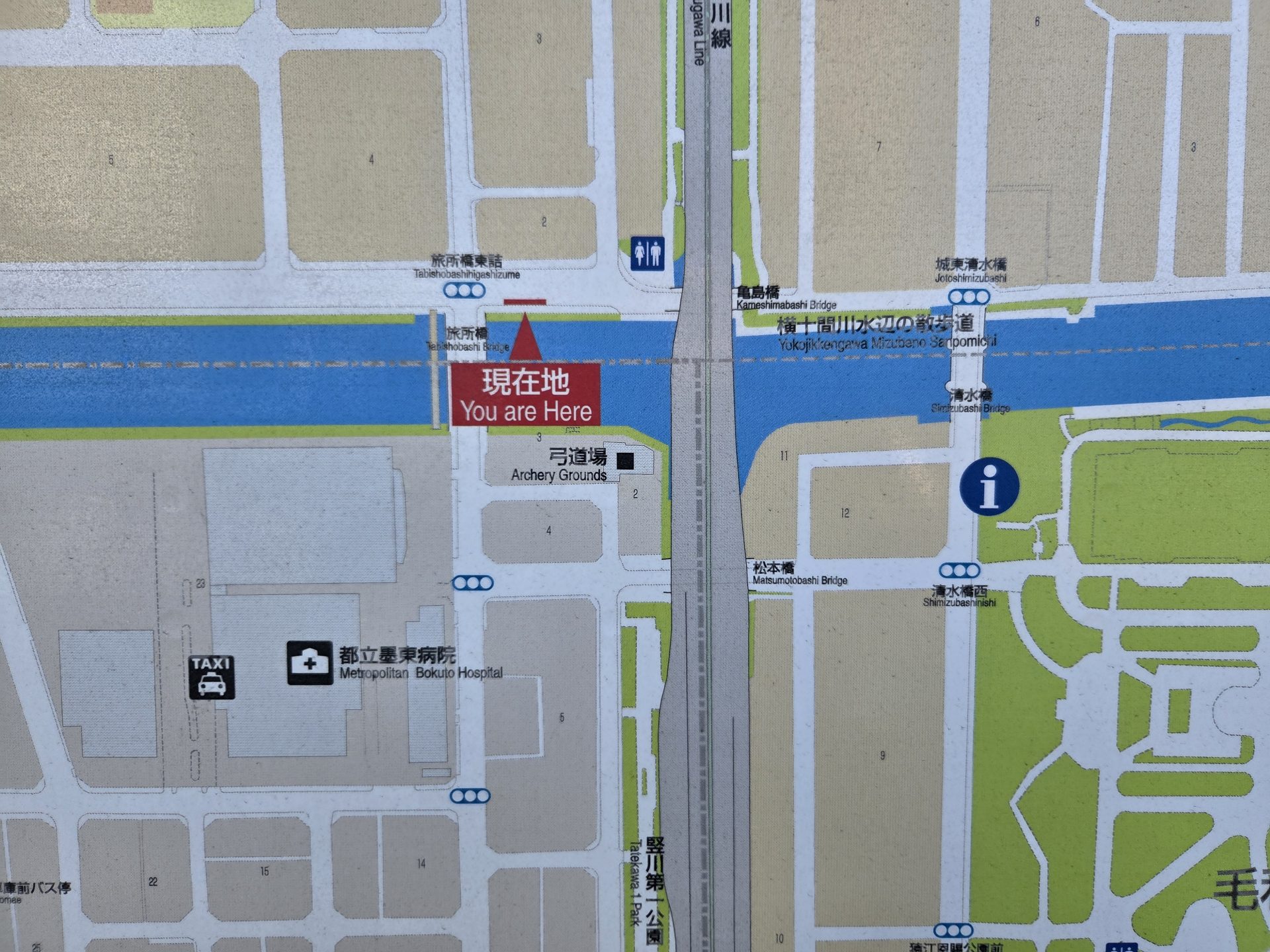 橋の南側は江東区で、近くに猿江恩賜公園がある。橋の北側は墨田区で、渡ったところに墨東病院の大きな建物がある。そのさらに北は錦糸町駅。橋の東側は横十間川で、堅川の暗渠に添って西側にいけば大横川親水公園にたどり着く。地図で確認すると、ちょうど荒川と隅田川に挟まれたエリアにある。