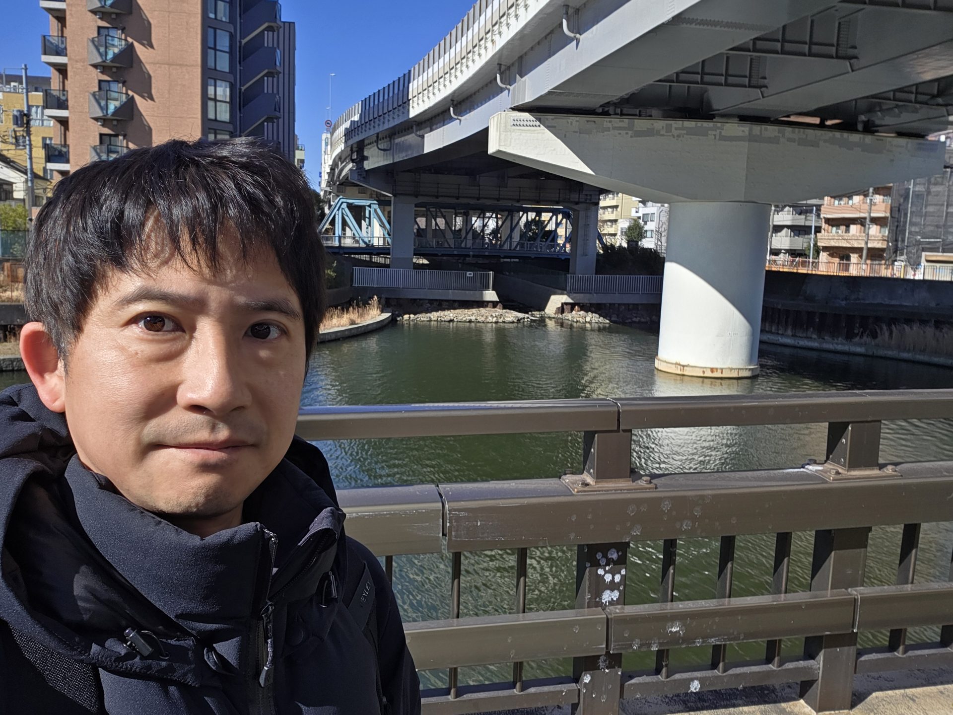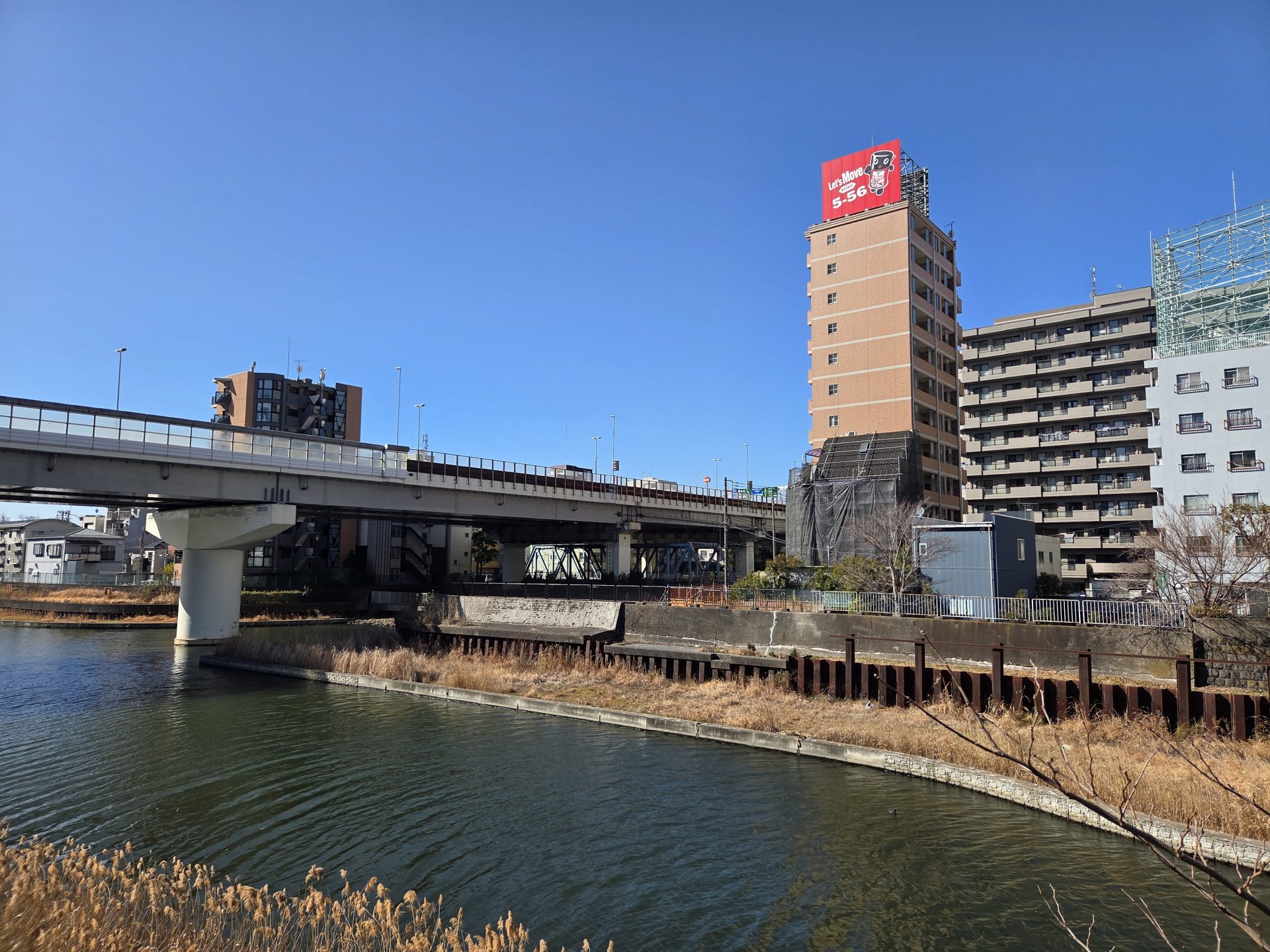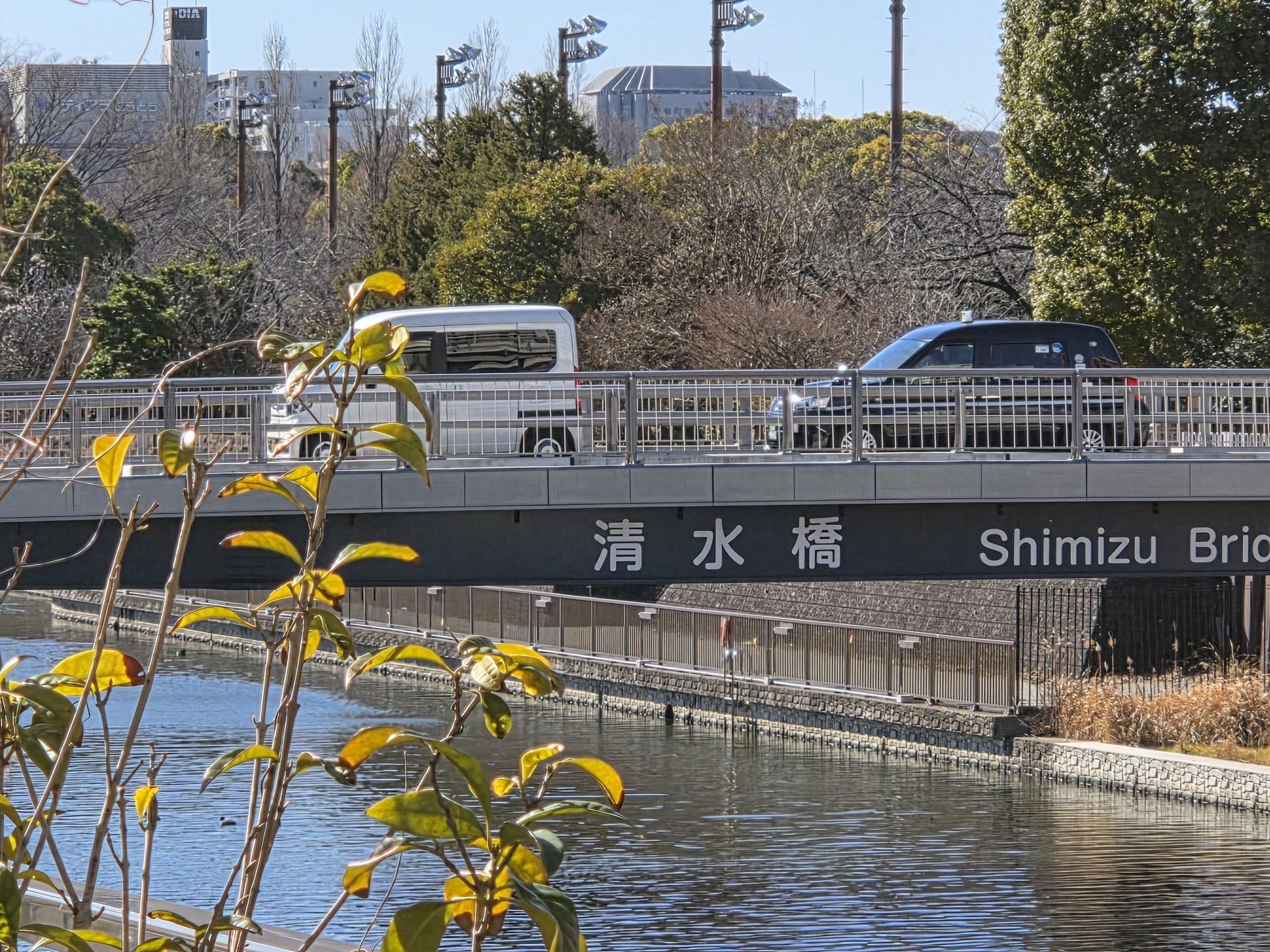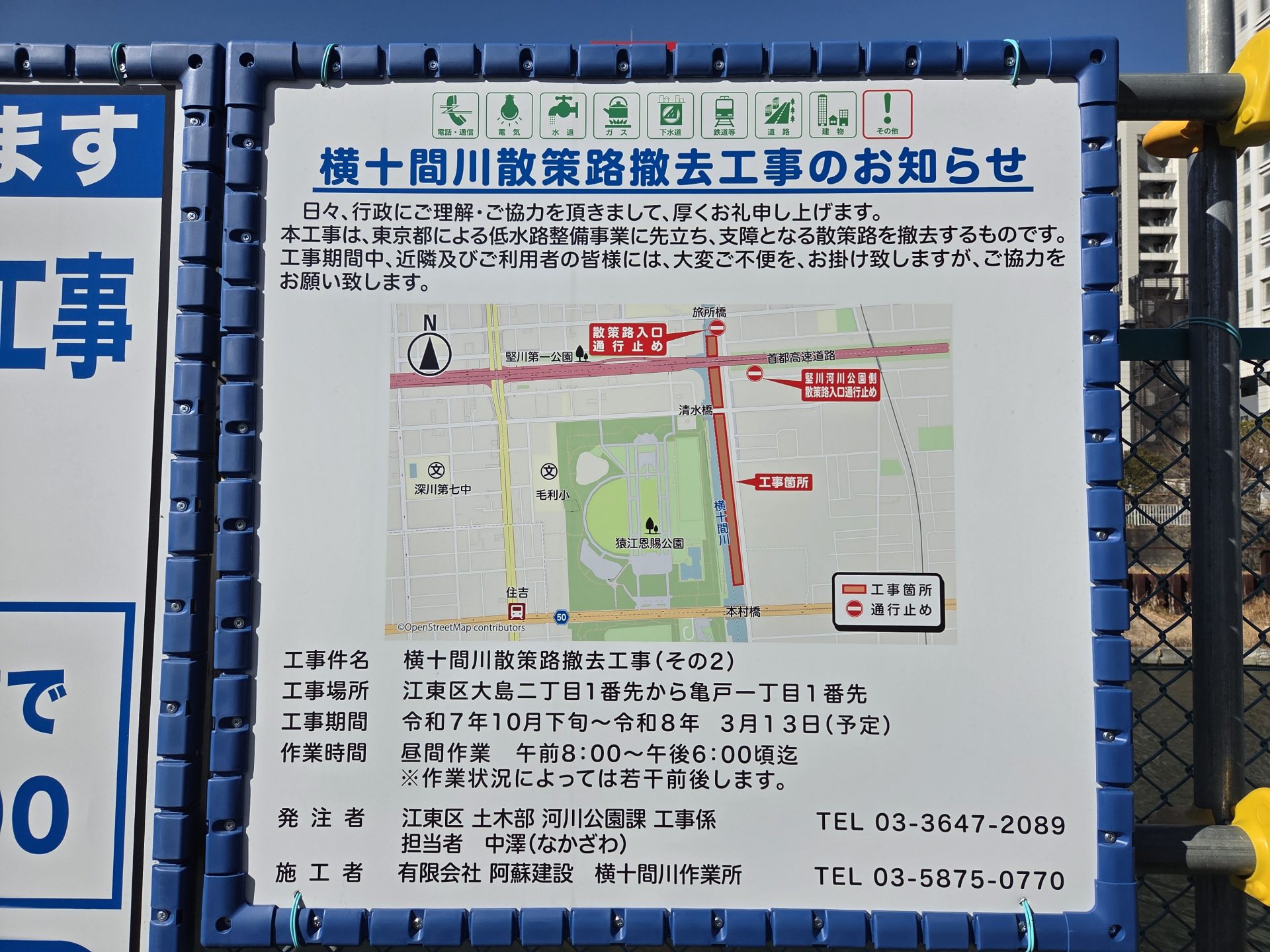 橋の南側は江東区で、近くに猿江恩賜公園がある。橋の北側は墨田区で、渡ったところに墨東病院の大きな建物がある。そのさらに北は錦糸町駅。橋の東側は横十間川で、堅川の暗渠に添って西側にいけば大横川親水公園にたどり着く。地図で確認すると、ちょうど荒川と隅田川に挟まれたエリアにある。