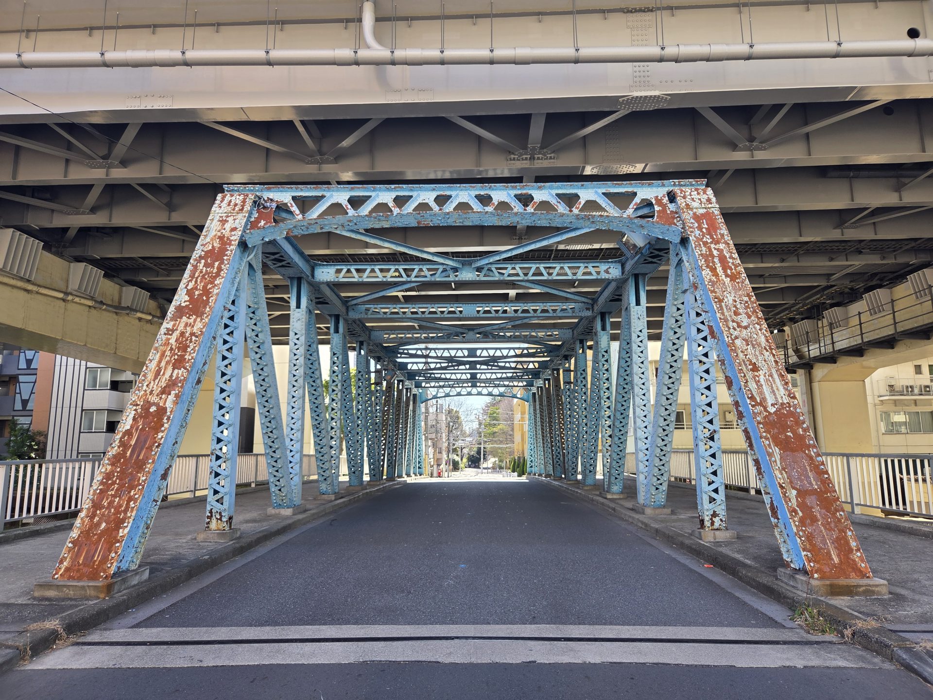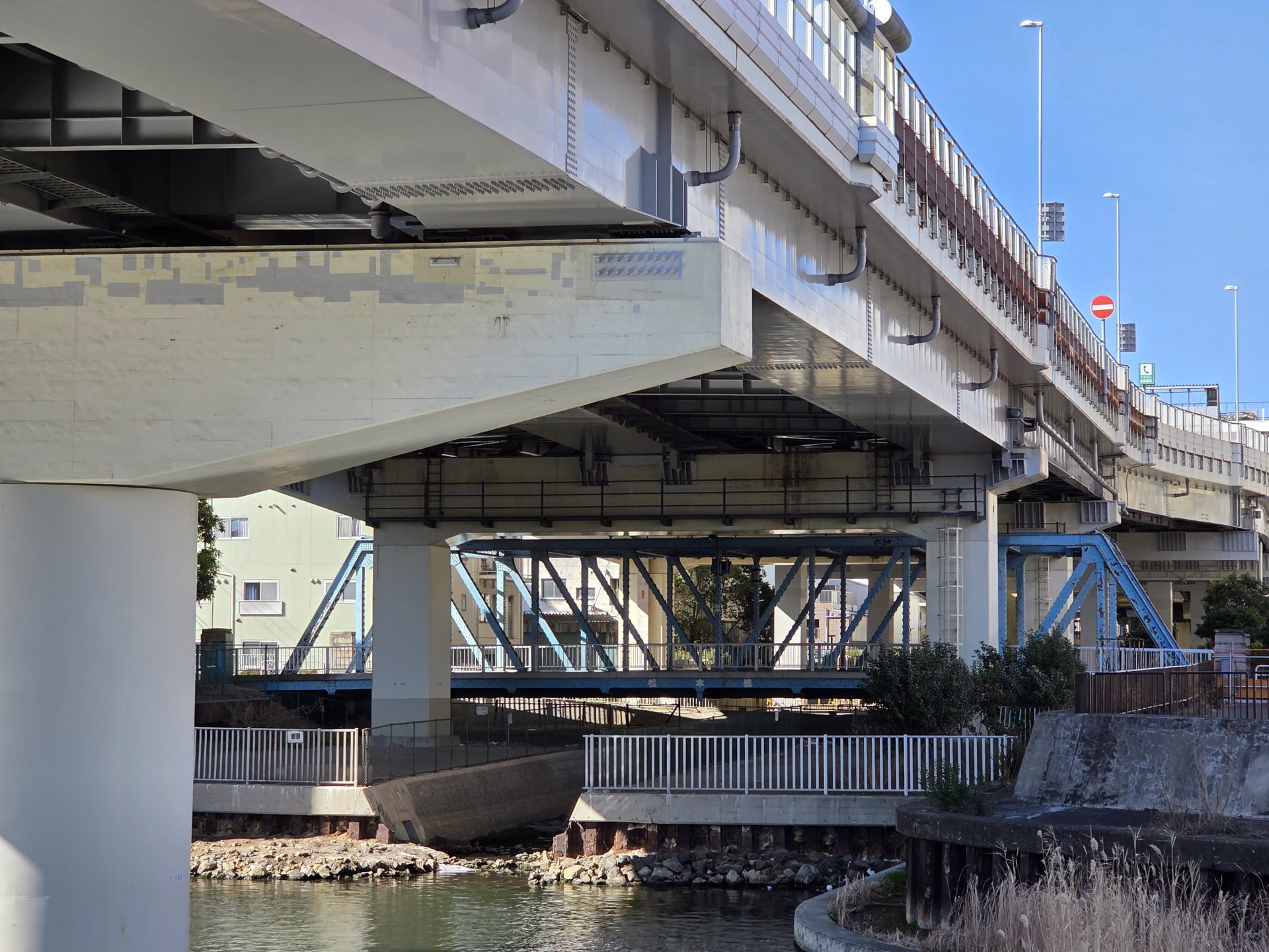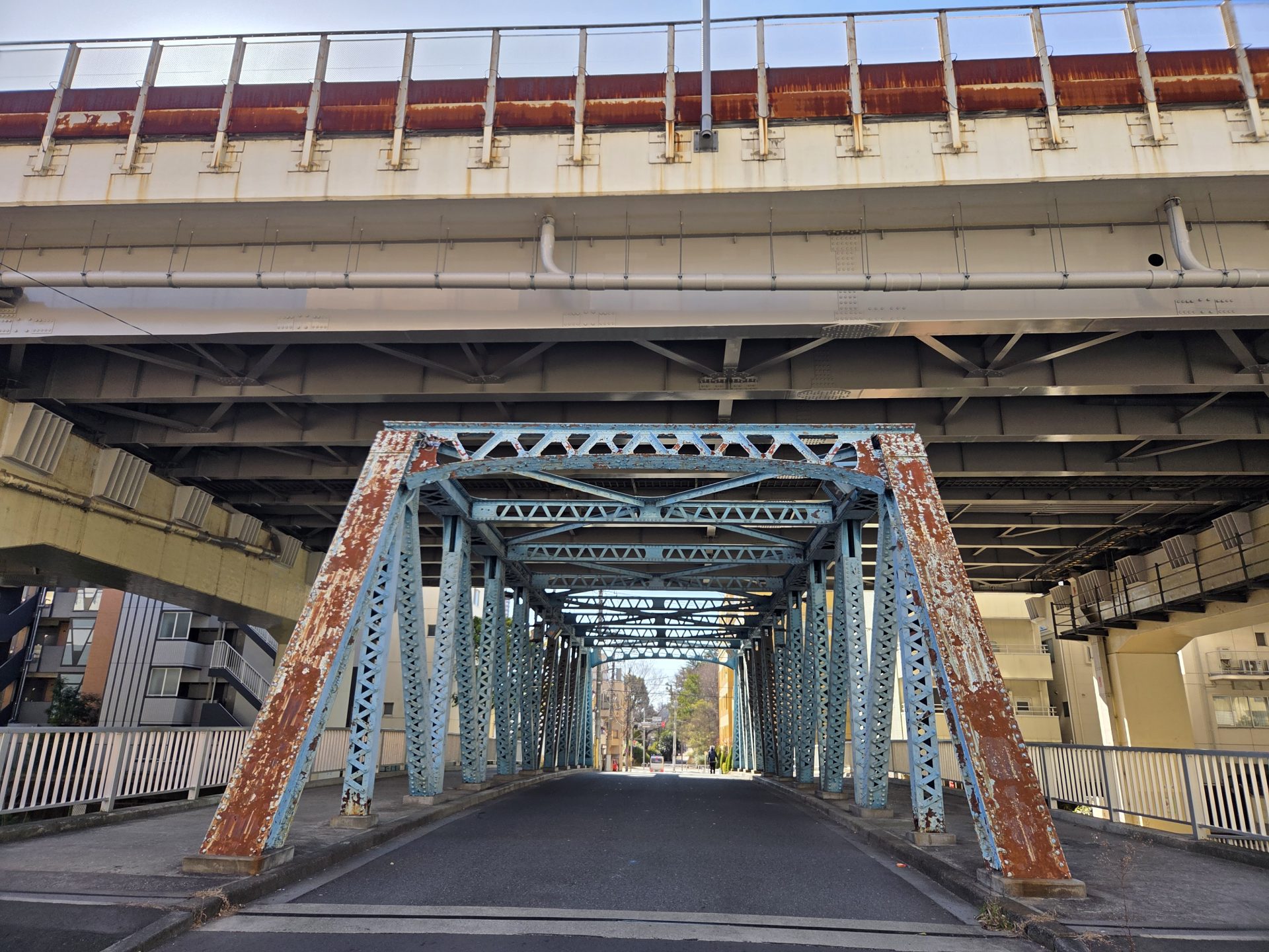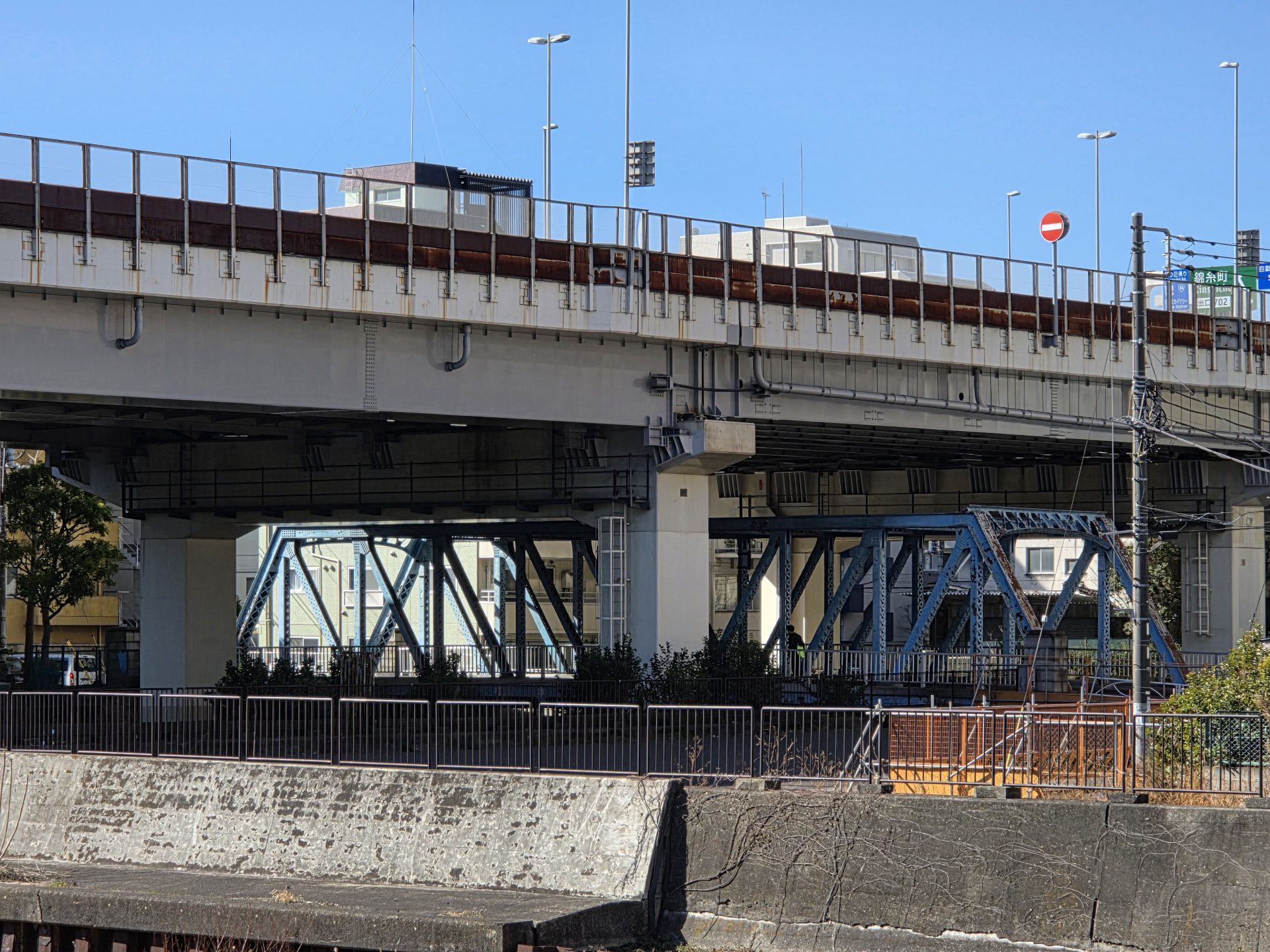 遠くから眺めると、高速道路の高架下に、川もないのに立派なトラス橋があるという、なにやら不思議な景色になる。鋼鉄の宇宙船のような、そんな乗り物のように見えなくもない。