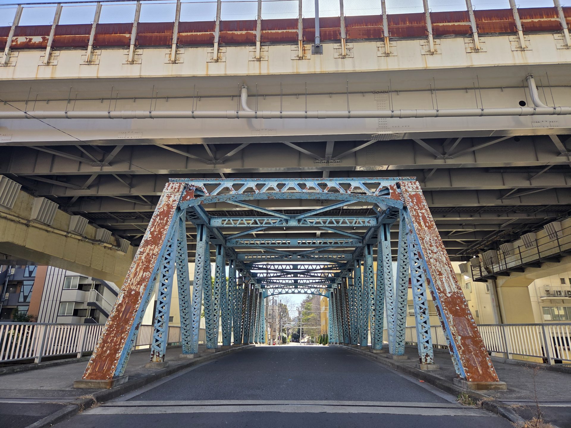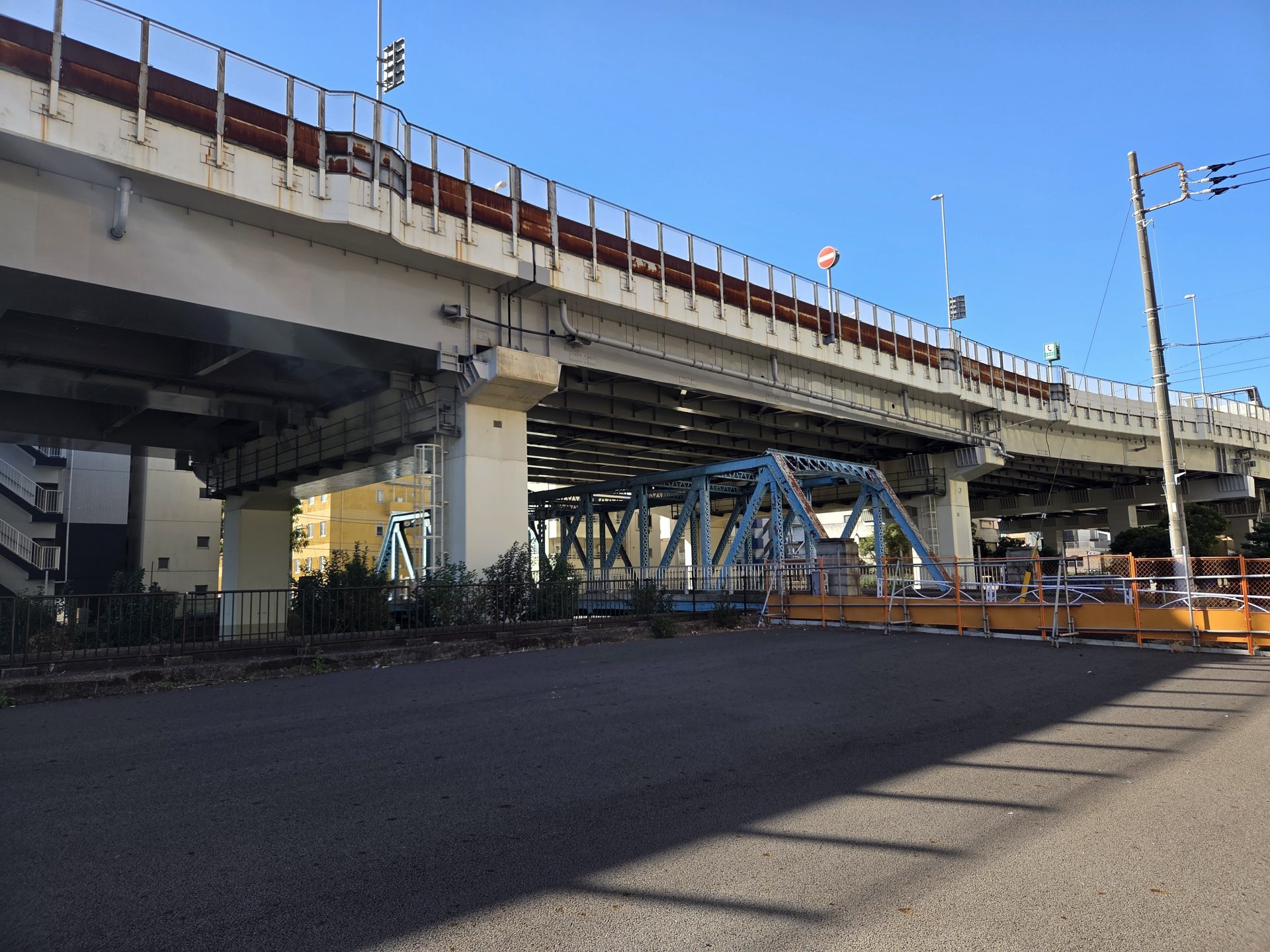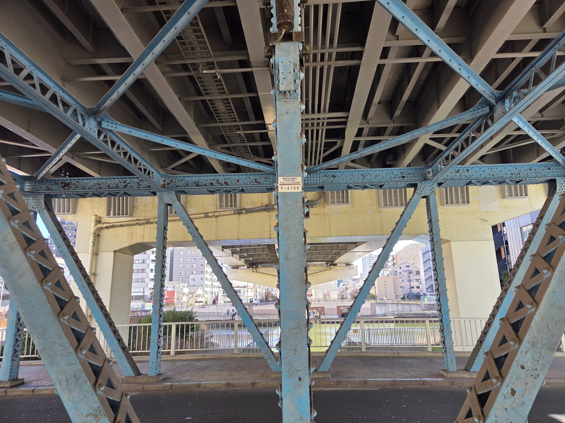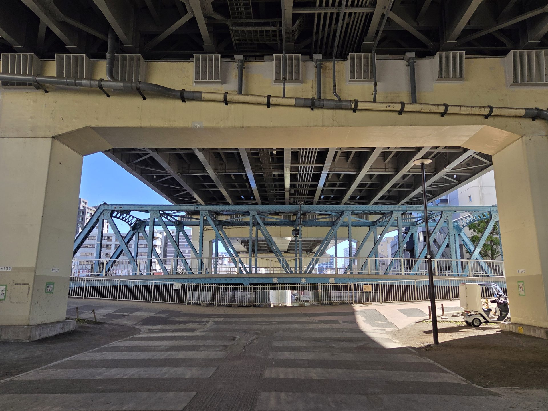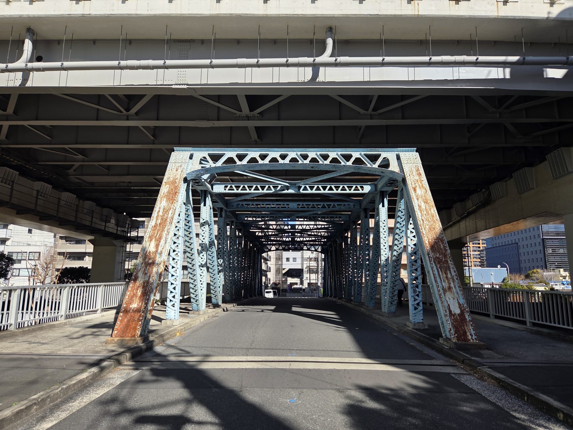 遠くから眺めると、高速道路の高架下に、川もないのに立派なトラス橋があるという、なにやら不思議な景色になる。鋼鉄の宇宙船のような、そんな乗り物のように見えなくもない。