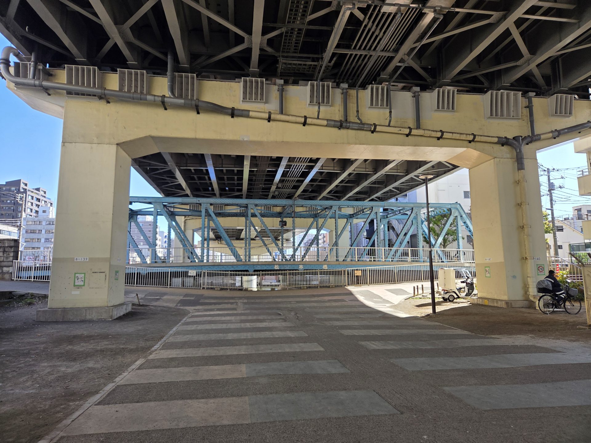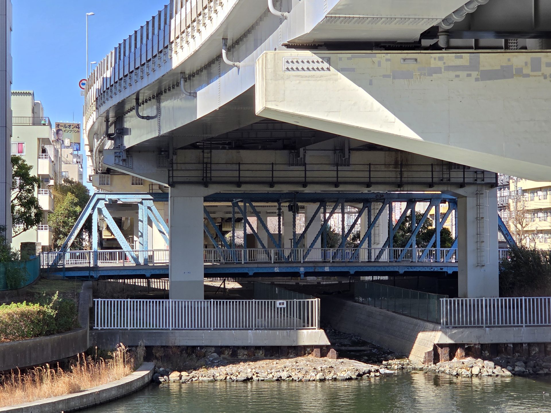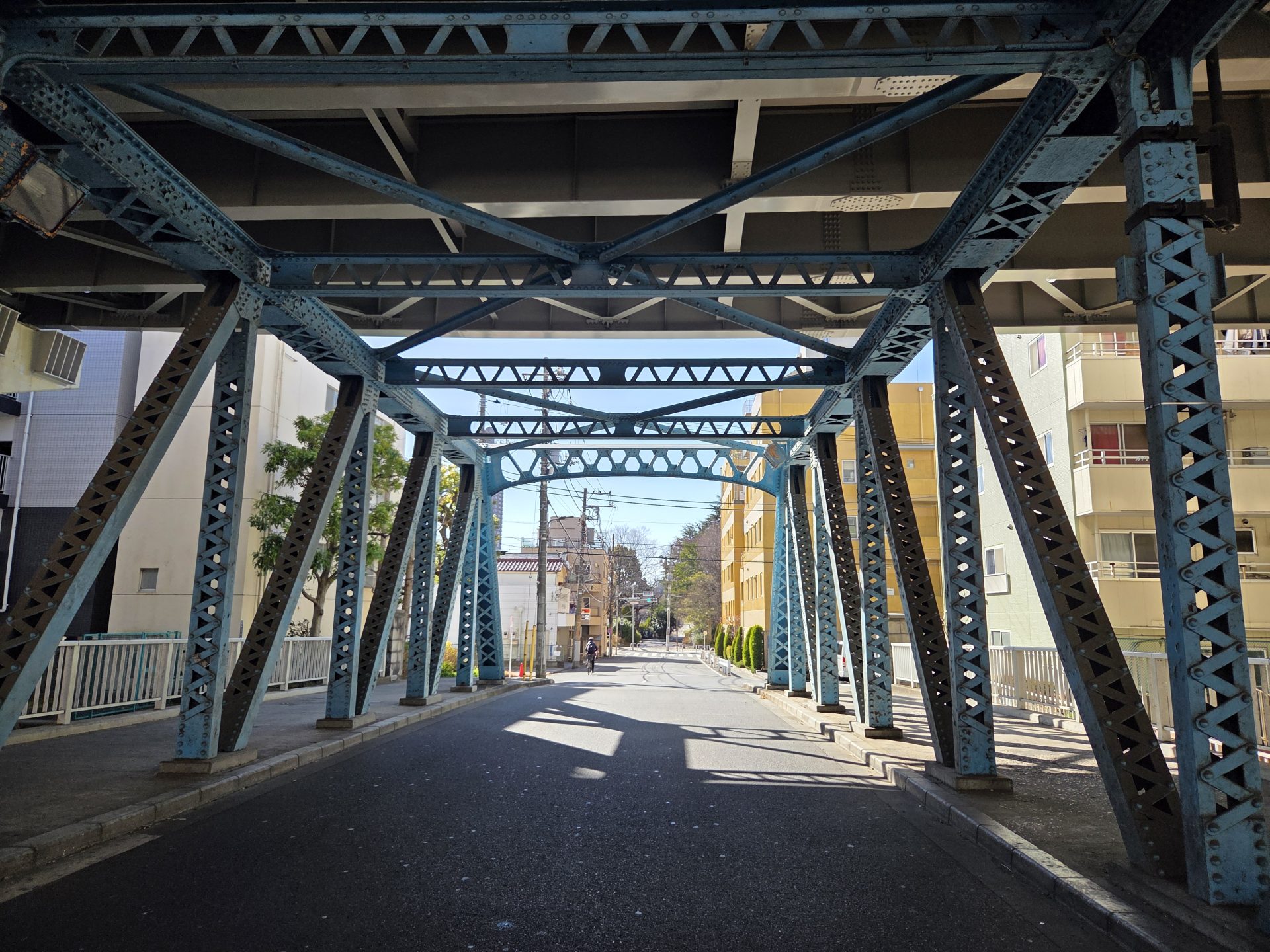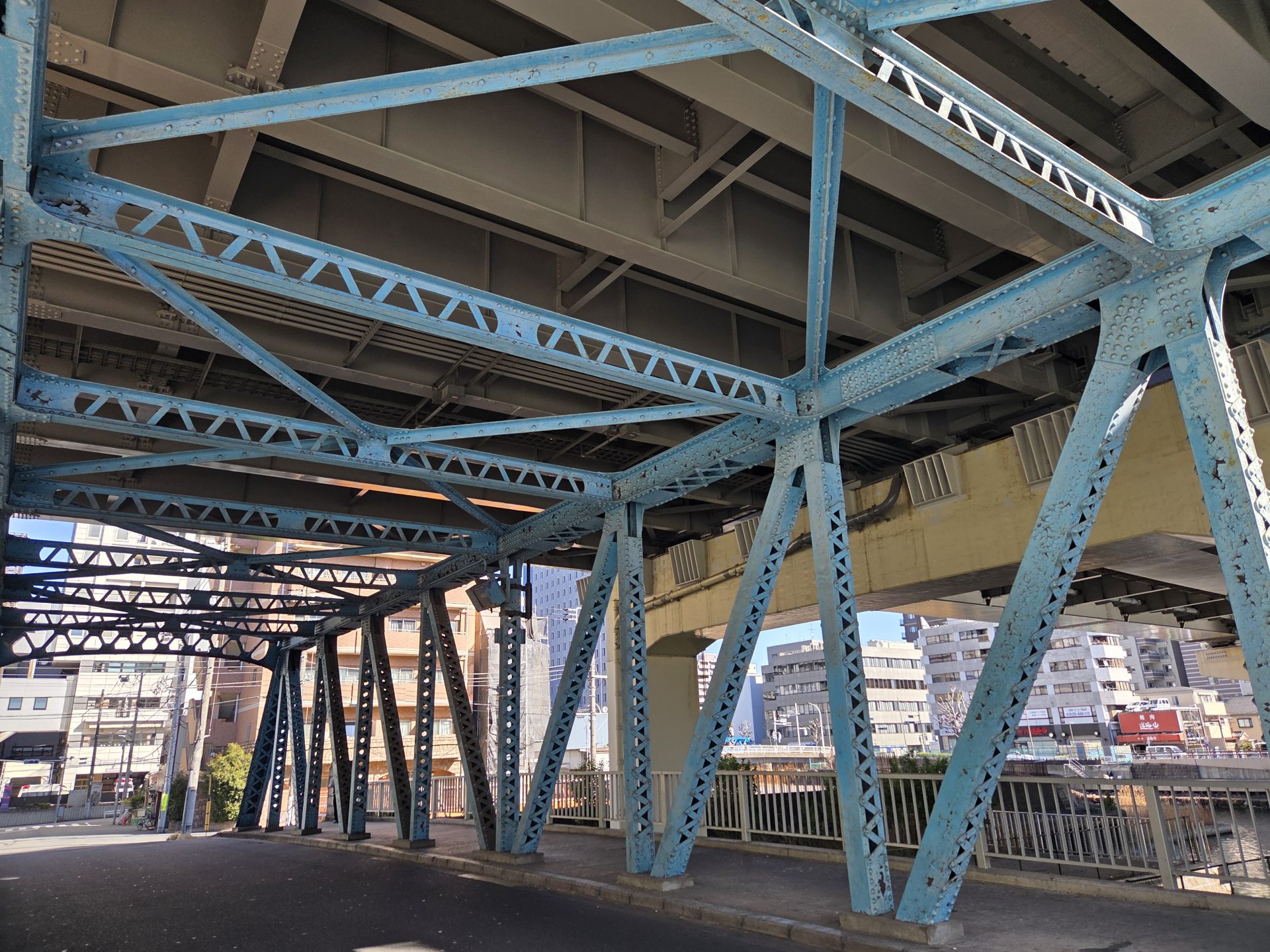 遠くから眺めると、高速道路の高架下に、川もないのに立派なトラス橋があるという、なにやら不思議な景色になる。鋼鉄の宇宙船のような、そんな乗り物のように見えなくもない。