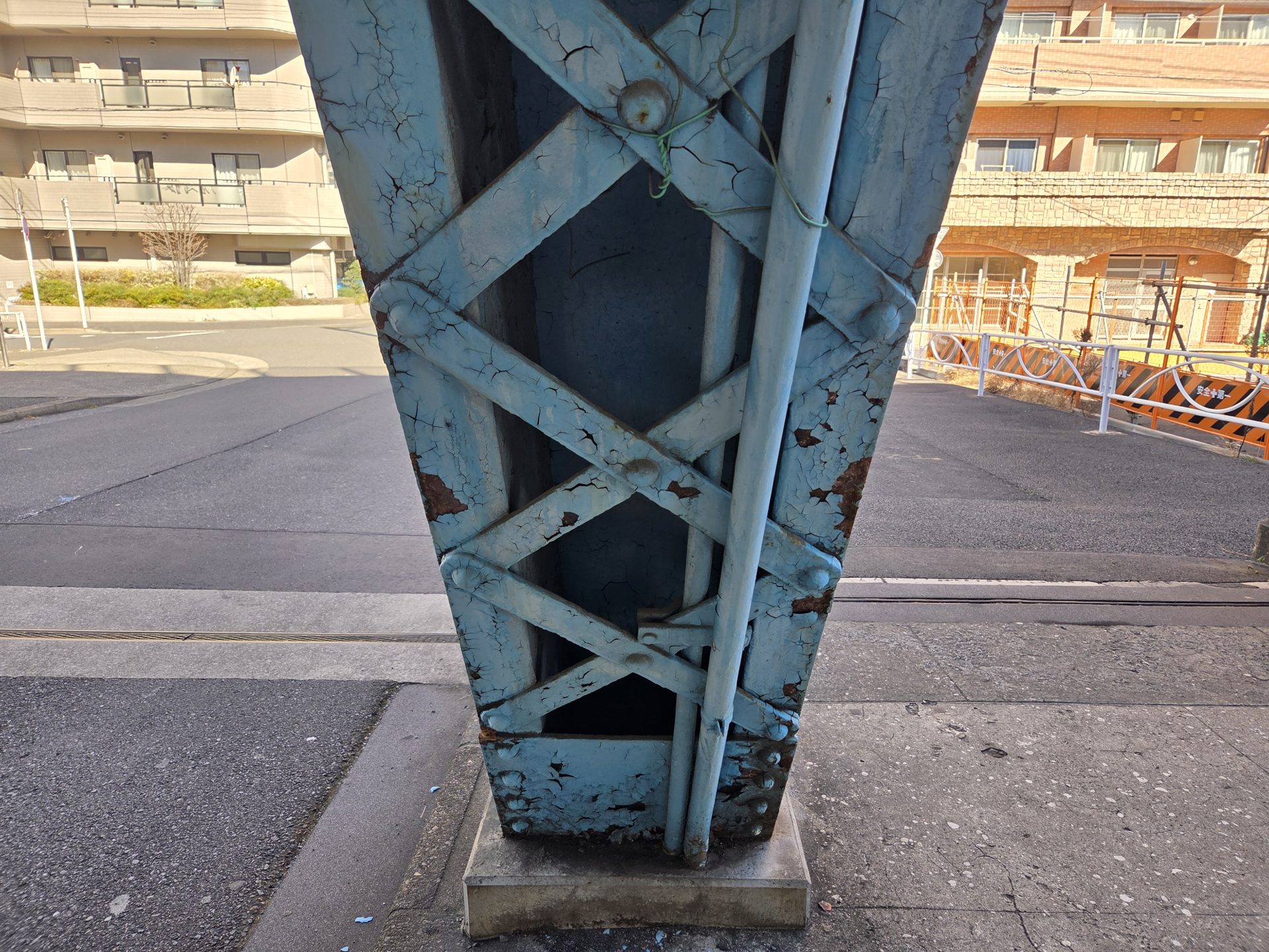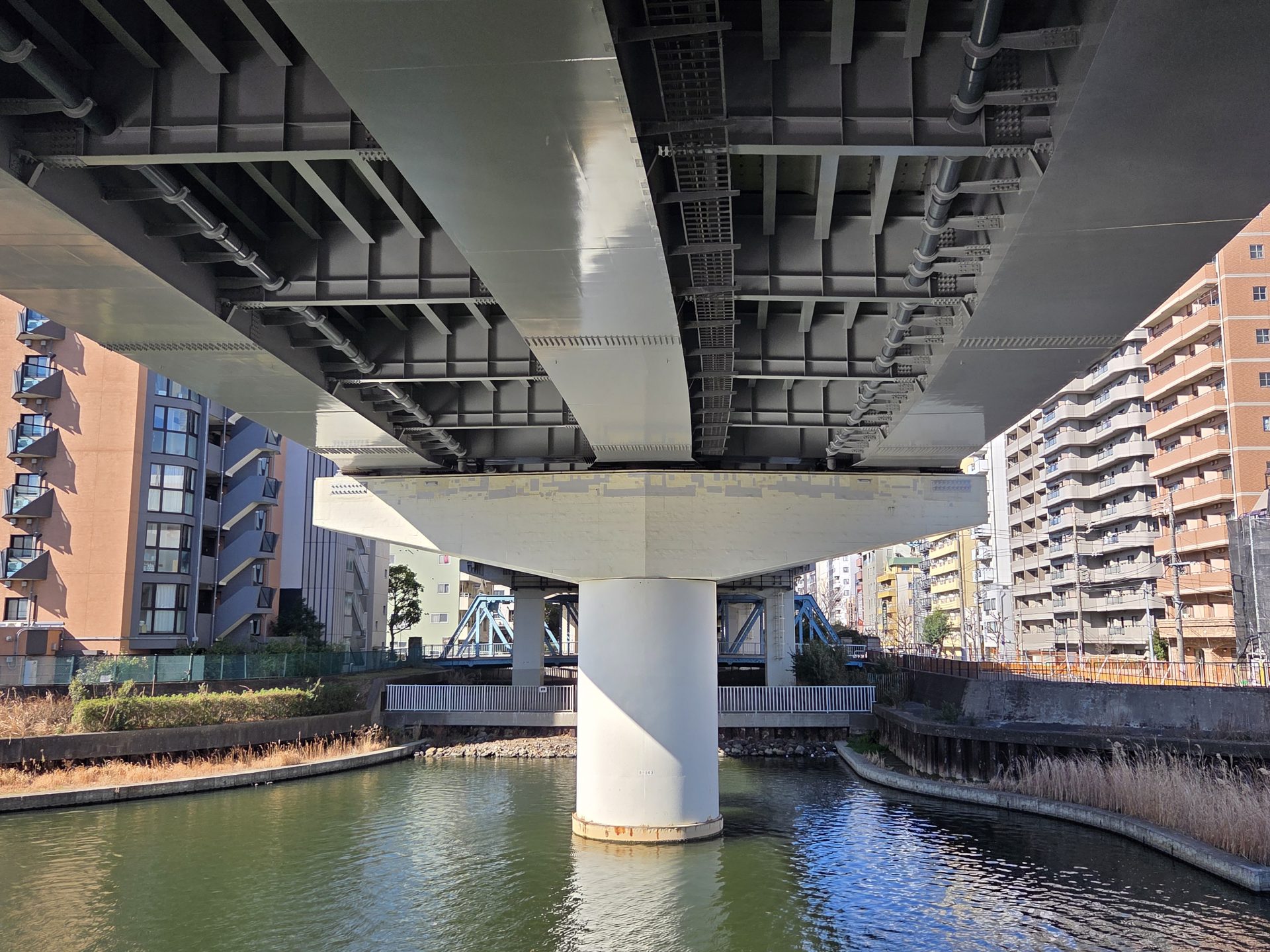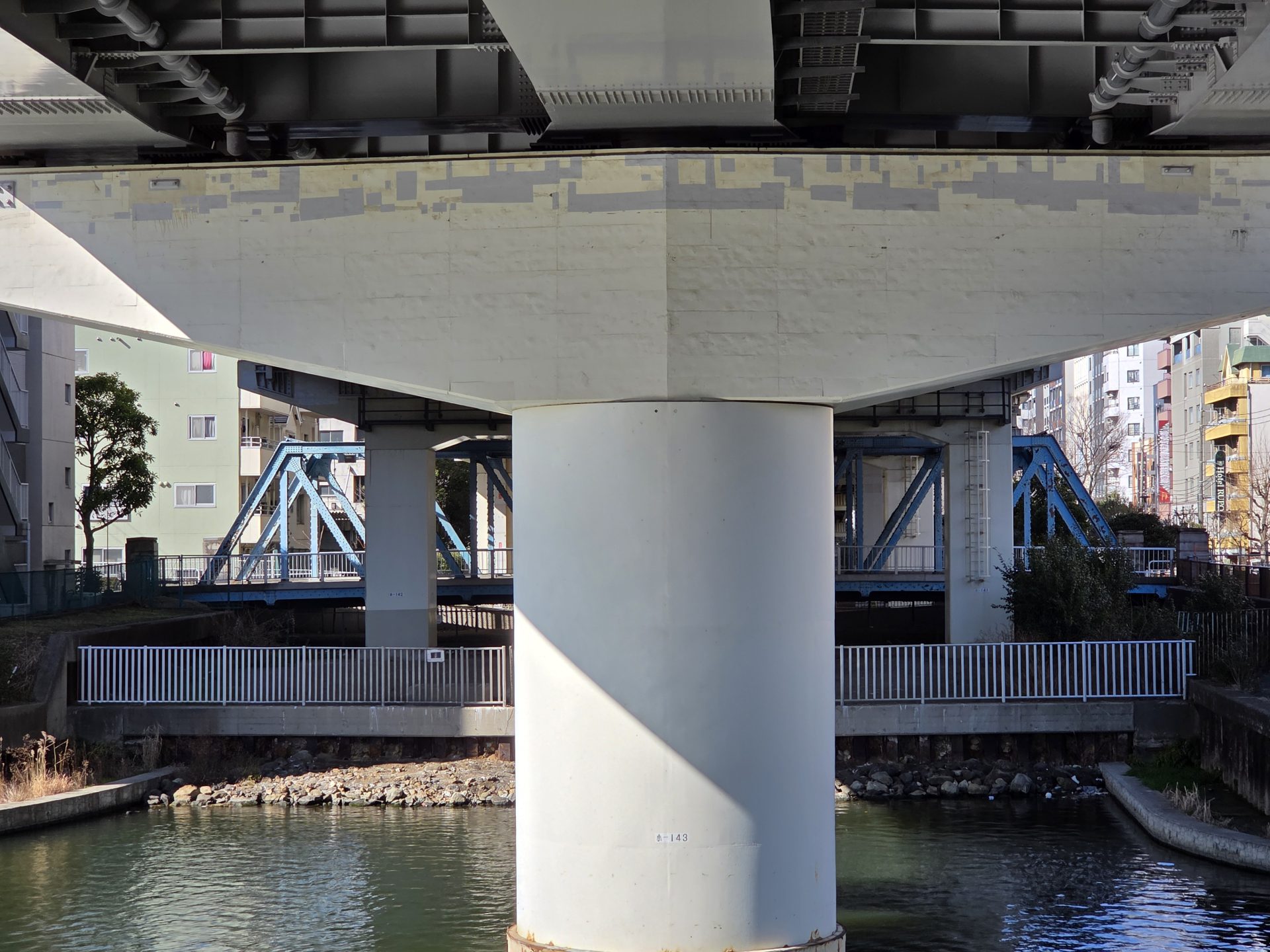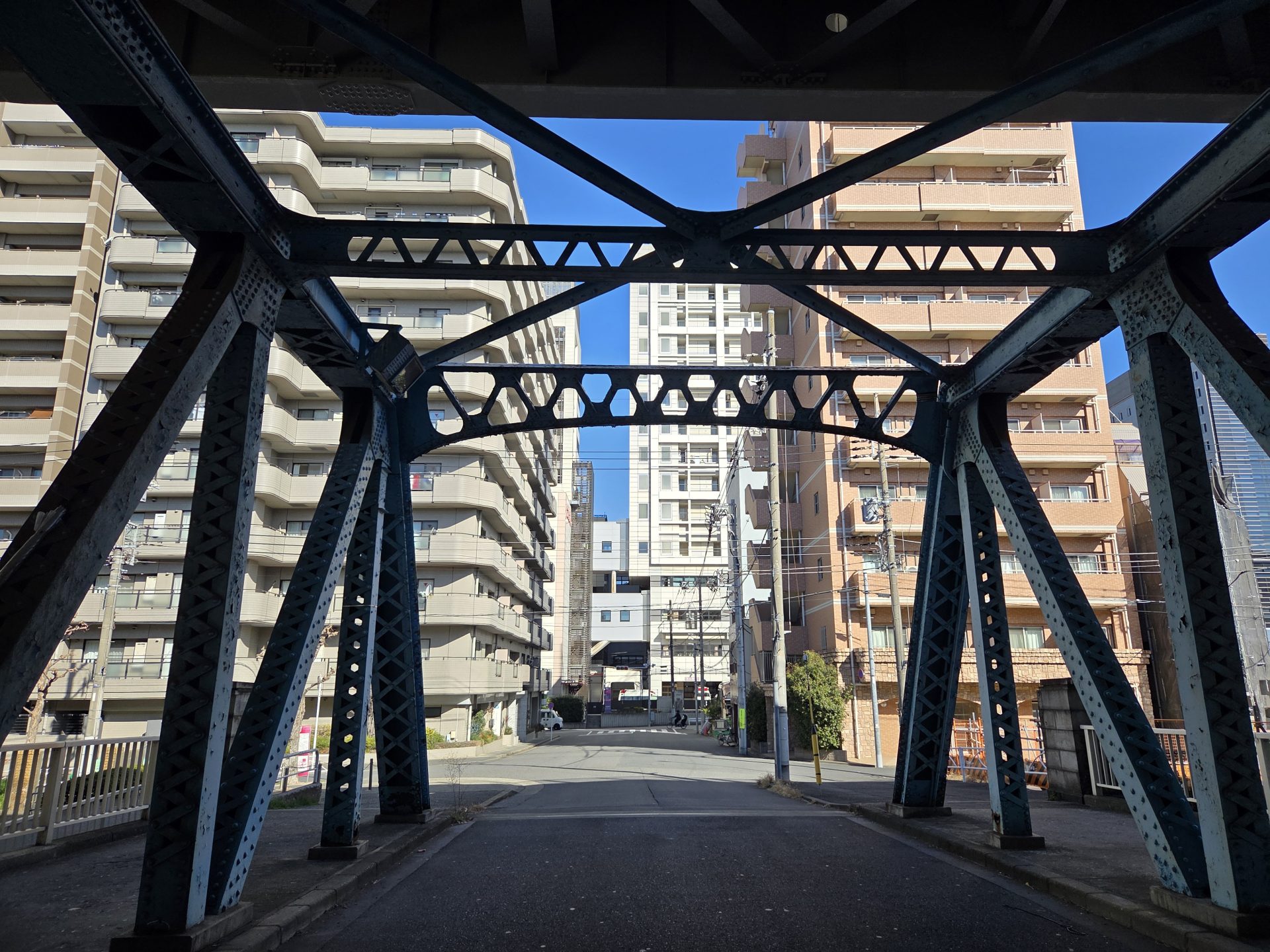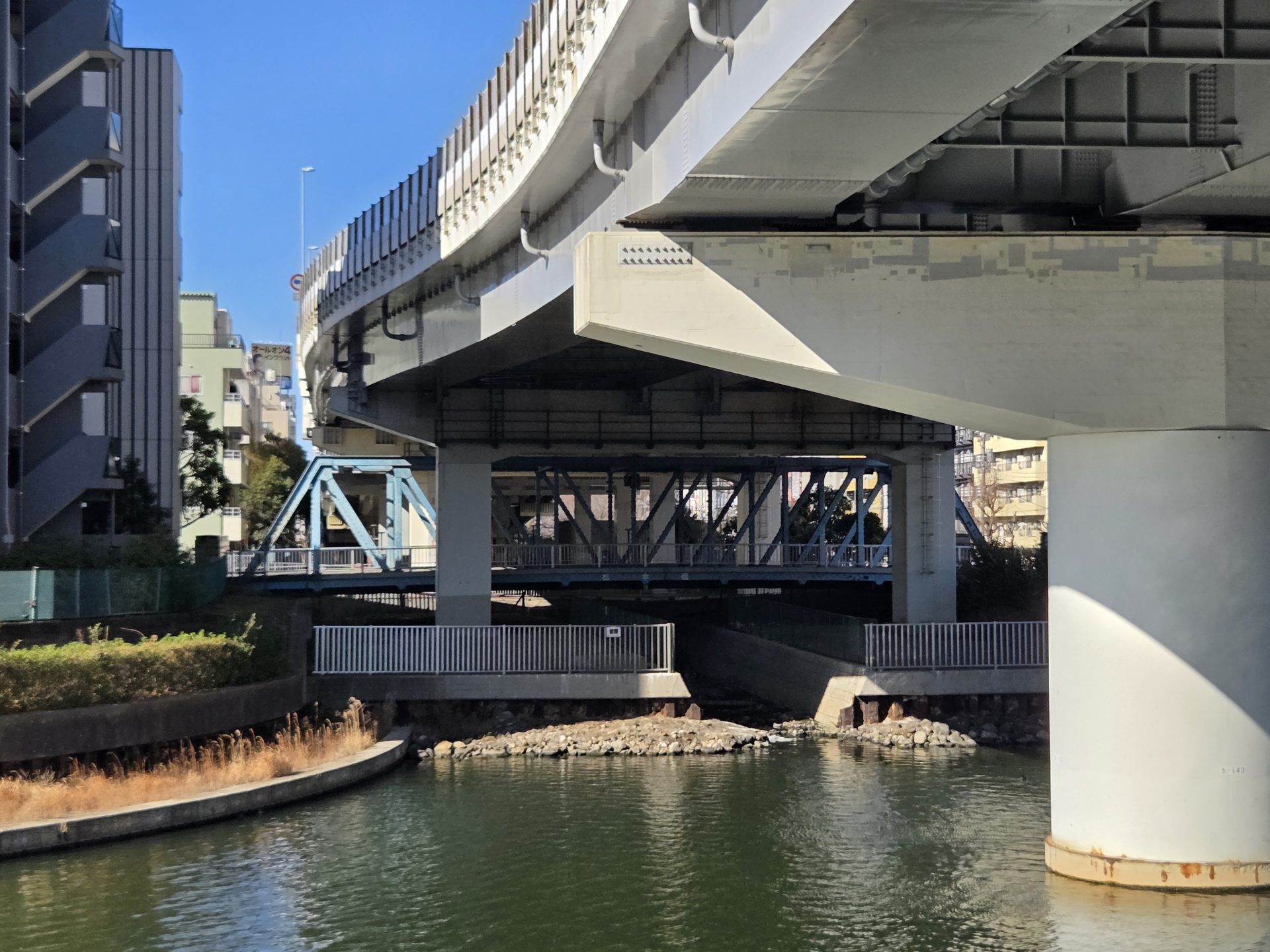 遠くから眺めると、高速道路の高架下に、川もないのに立派なトラス橋があるという、なにやら不思議な景色になる。鋼鉄の宇宙船のような、そんな乗り物のように見えなくもない。