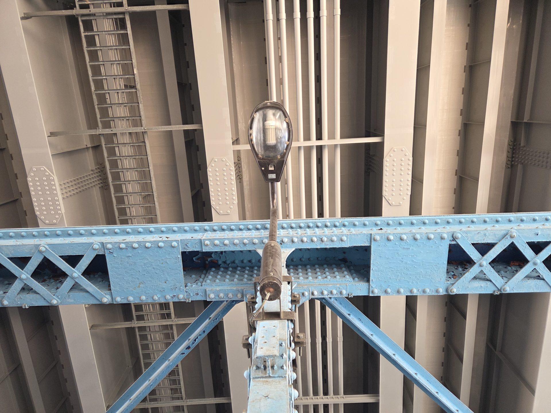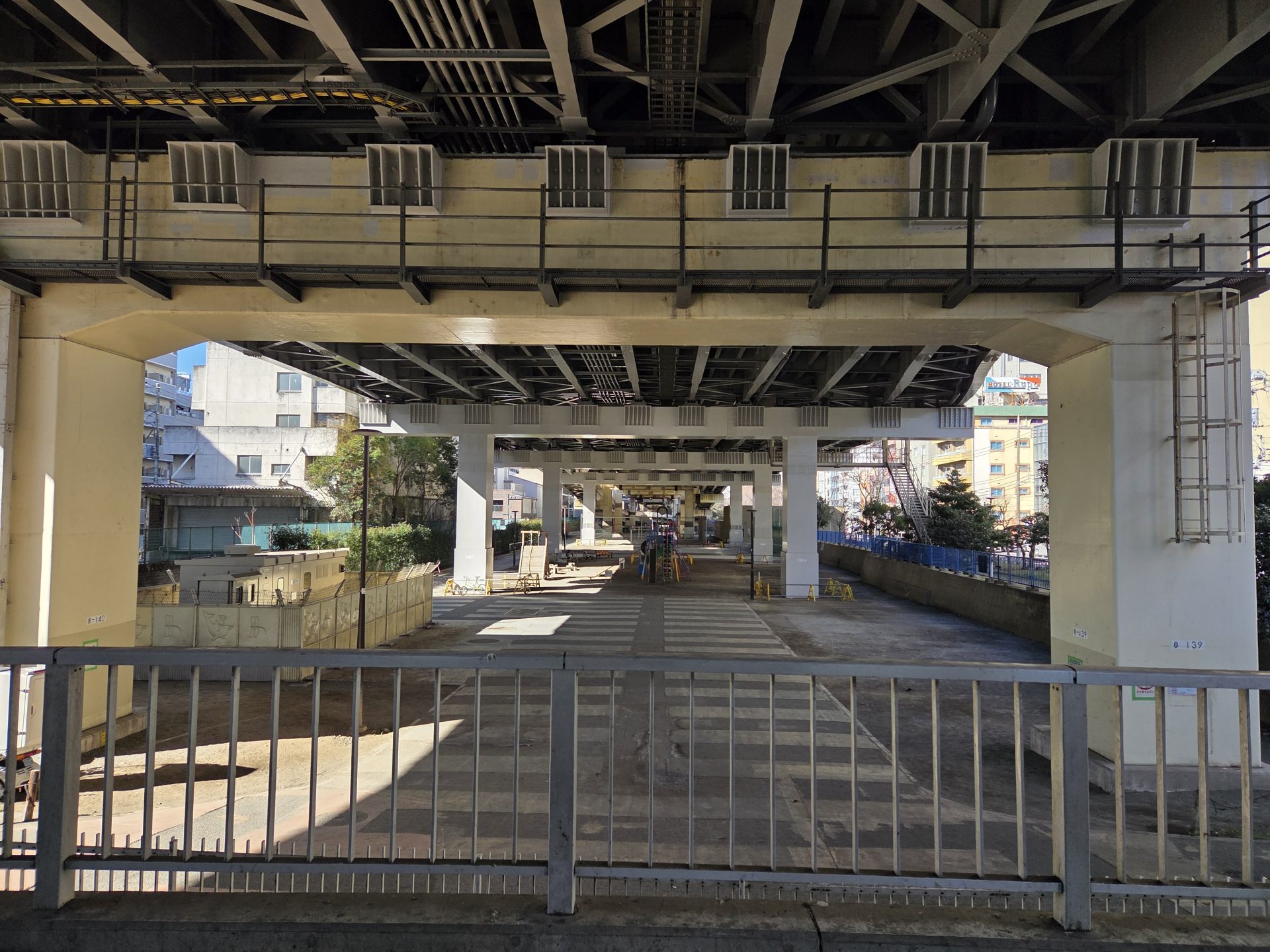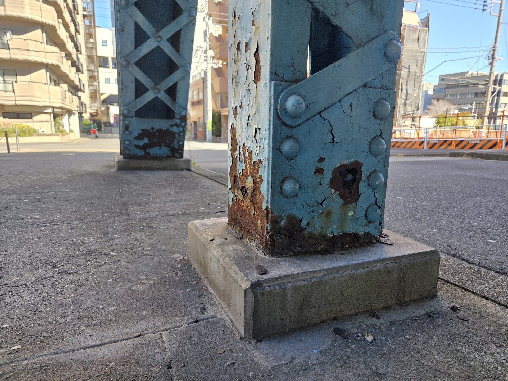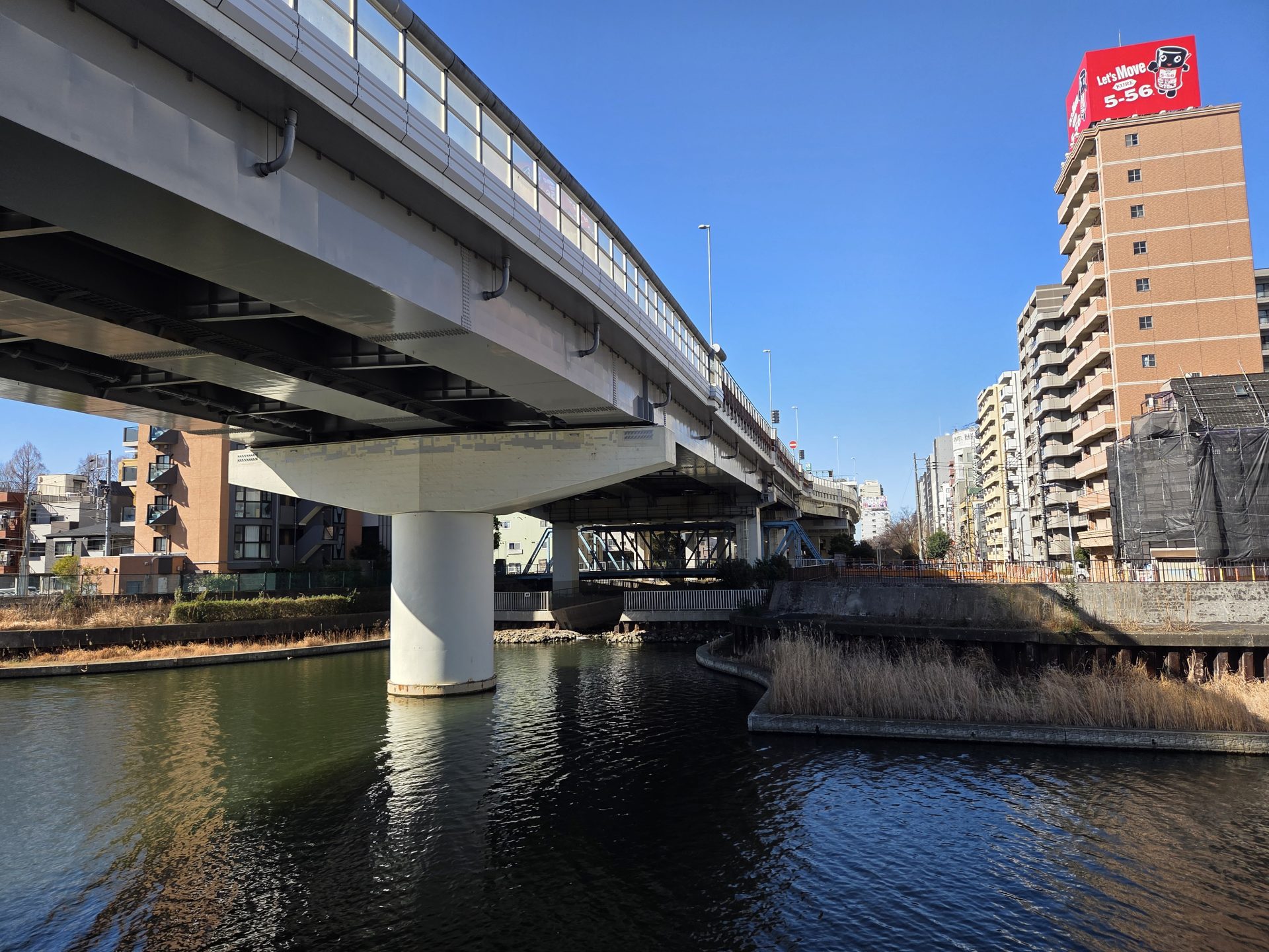 遠くから眺めると、高速道路の高架下に、川もないのに立派なトラス橋があるという、なにやら不思議な景色になる。鋼鉄の宇宙船のような、そんな乗り物のように見えなくもない。