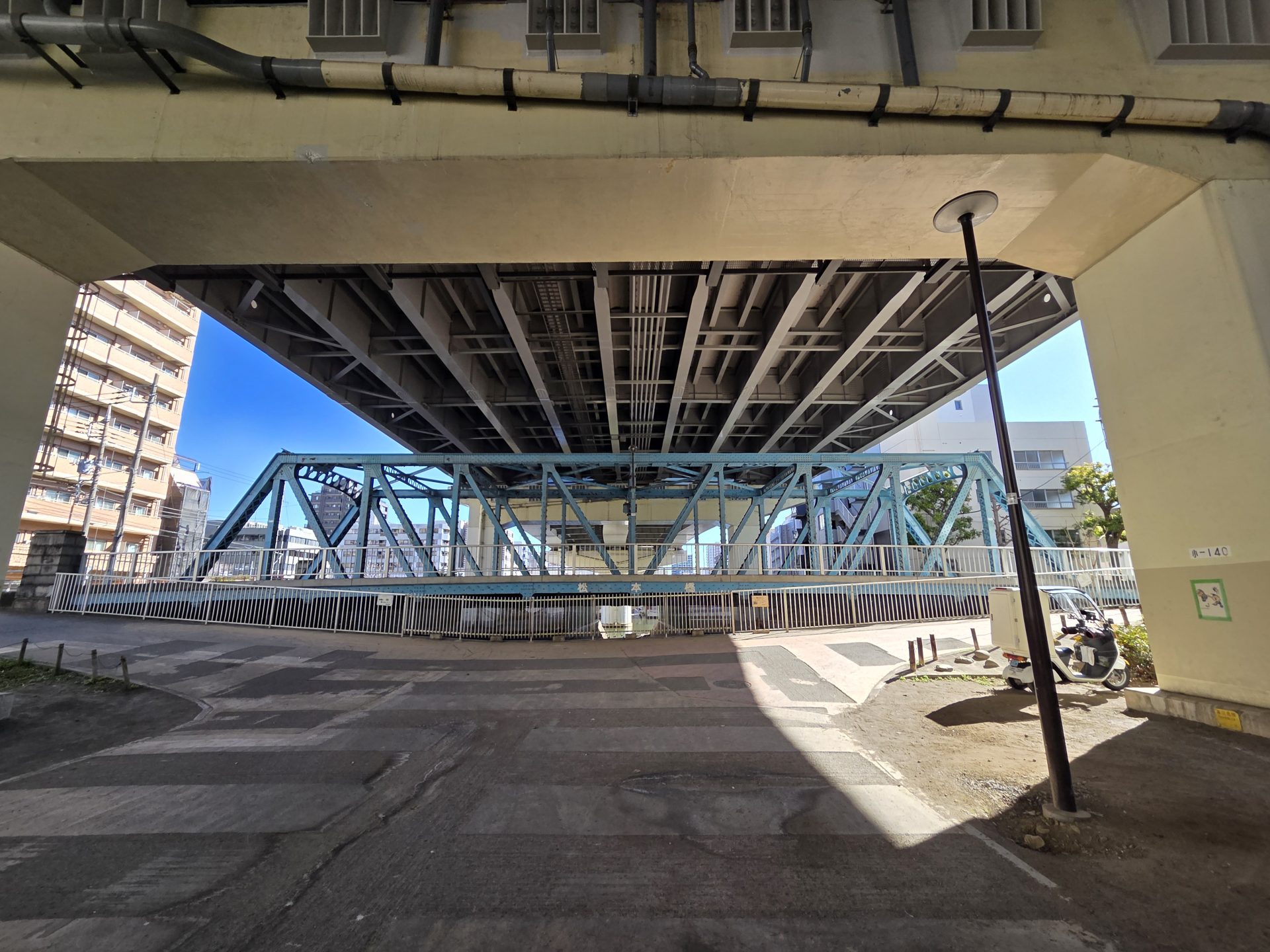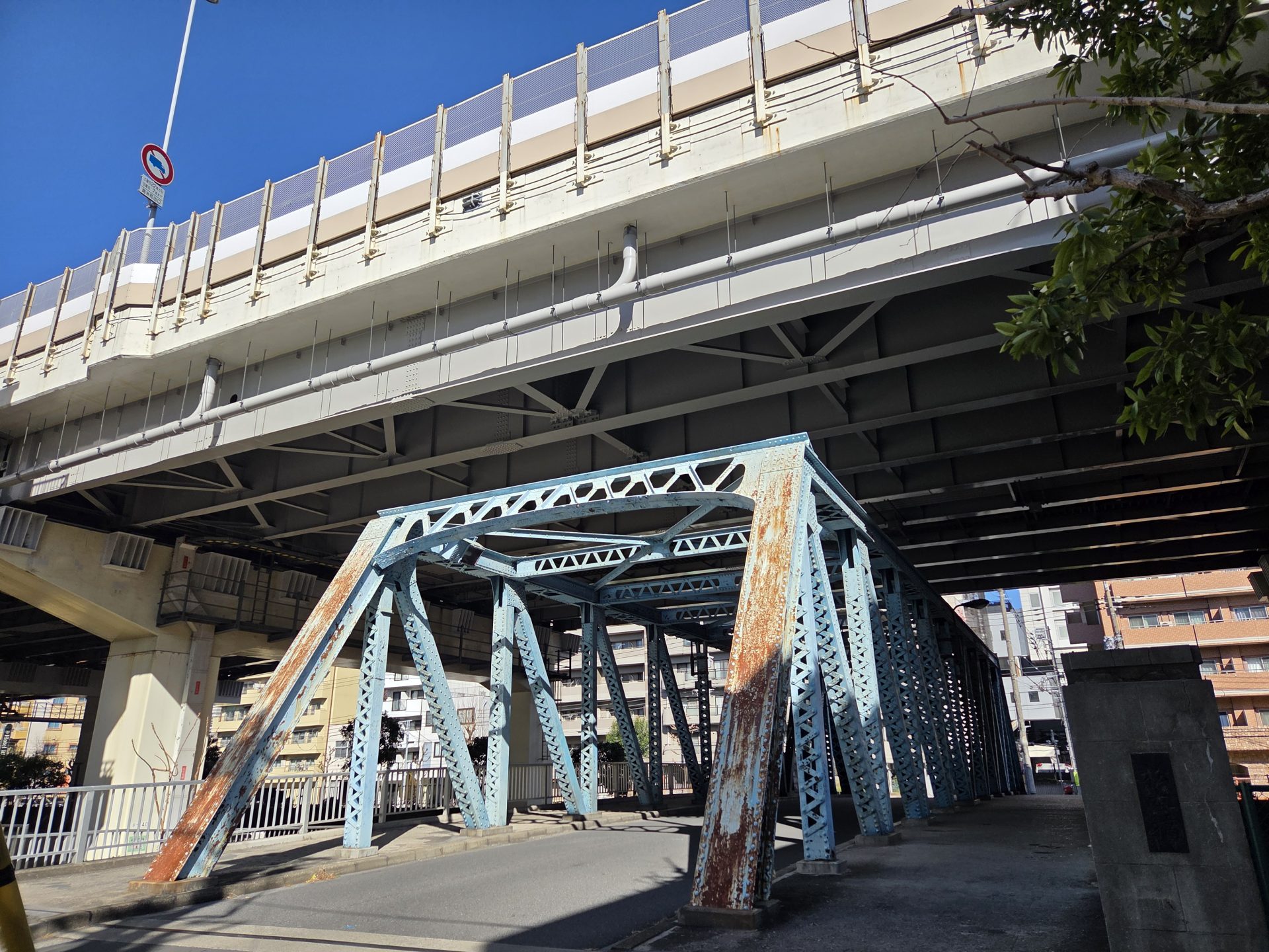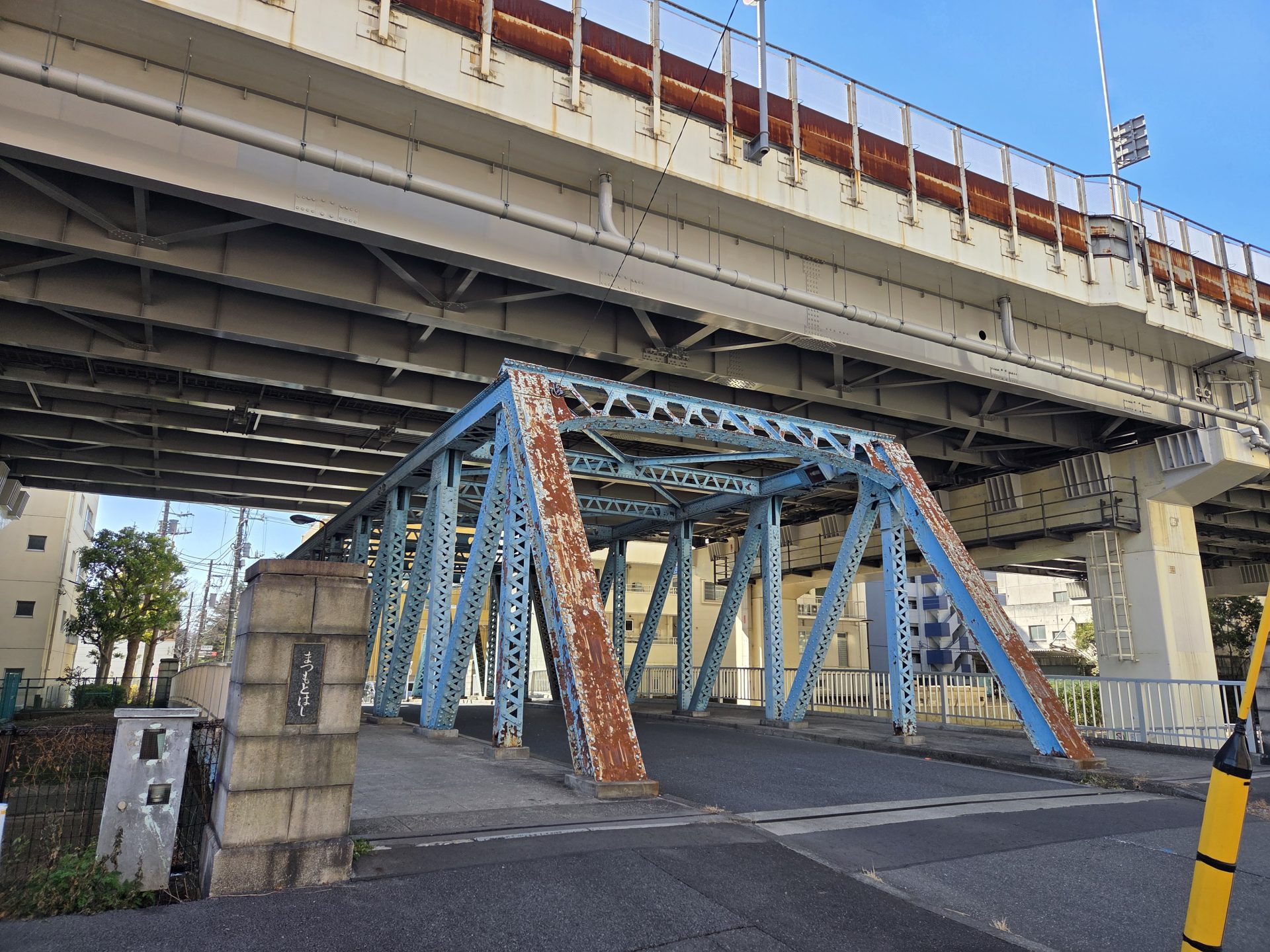 訪問時は勿論現役で、橋自体はそのまま自動車道路、両脇には歩道が追加敷設、電灯なども追加設置されている状態である。橋は「堅川」に架橋されている。といっても、堅川は「暗渠」になっており、橋の下に水はない。橋の真上は、首都高7号線で空が塞がれている。
