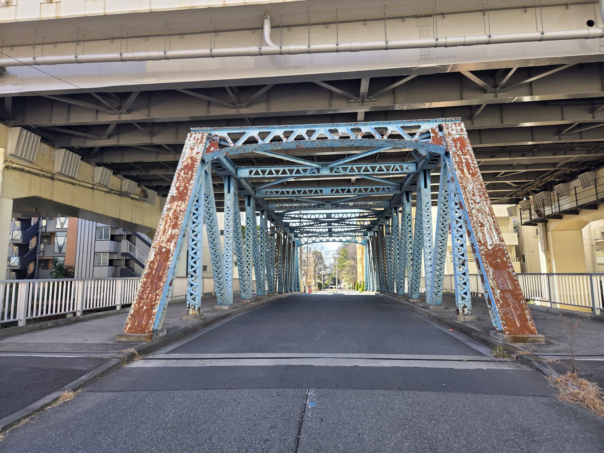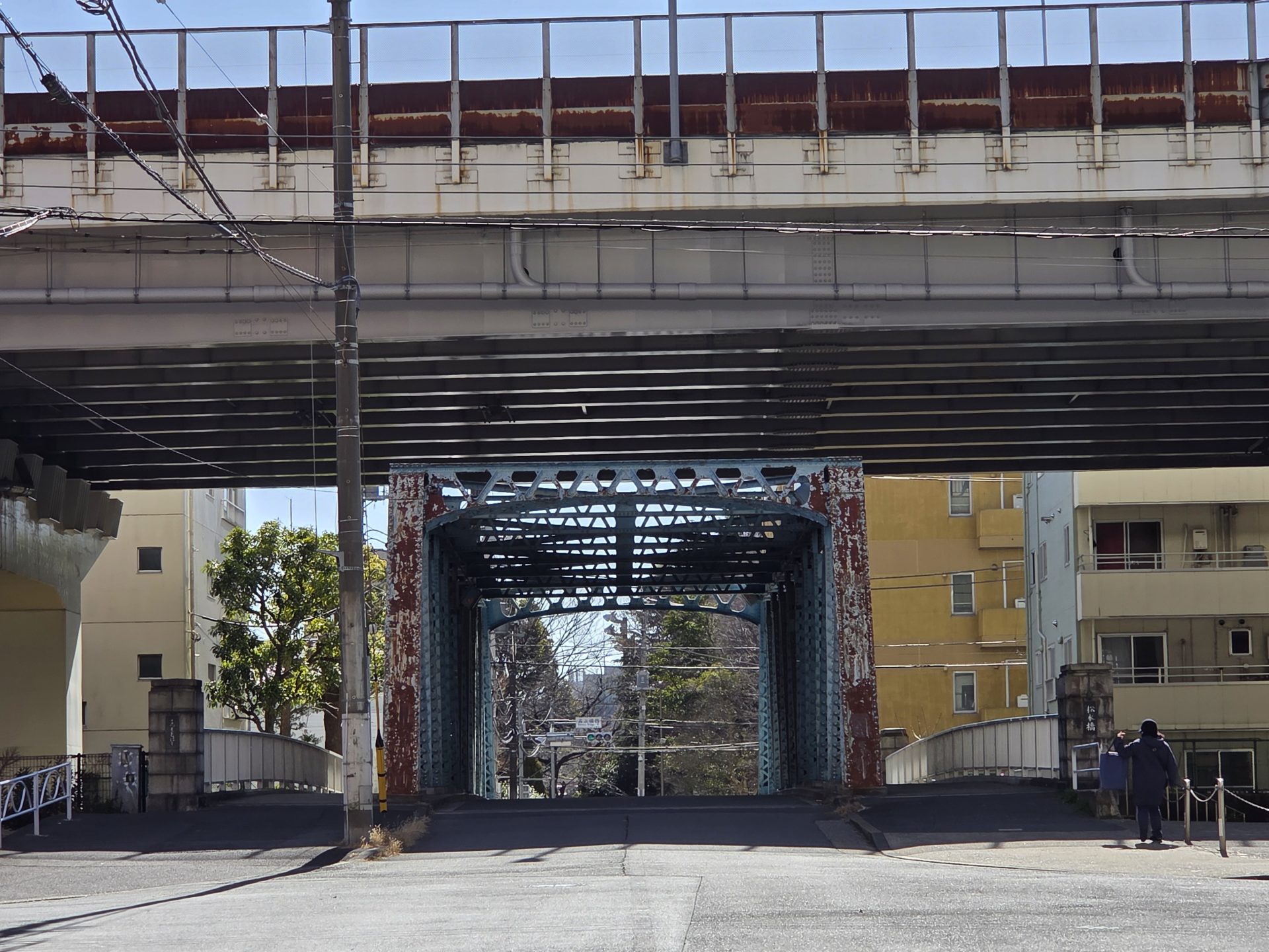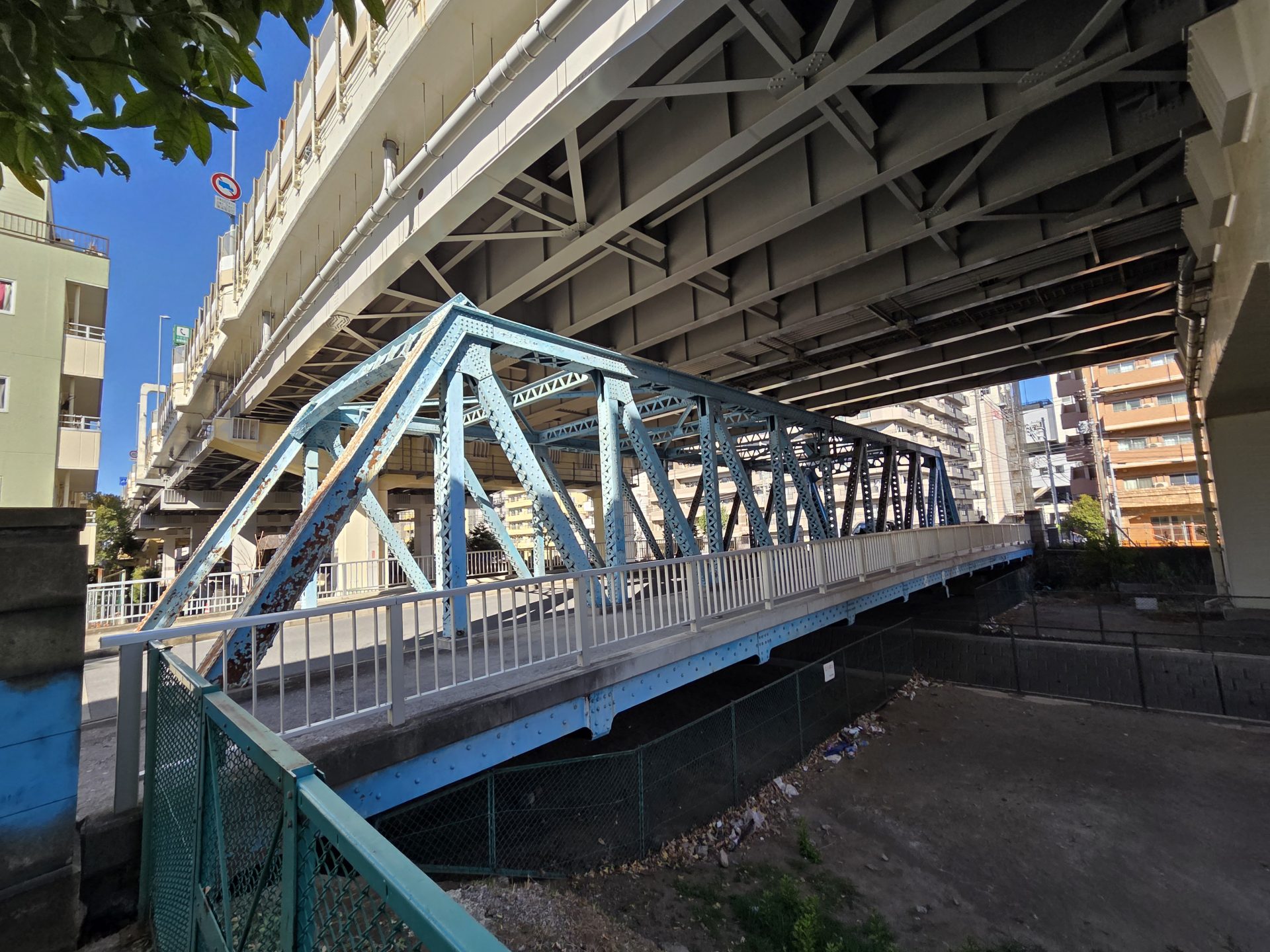 訪問時は勿論現役で、橋自体はそのまま自動車道路、両脇には歩道が追加敷設、電灯なども追加設置されている状態である。橋は「堅川」に架橋されている。といっても、堅川は「暗渠」になっており、橋の下に水はない。橋の真上は、首都高7号線で空が塞がれている。