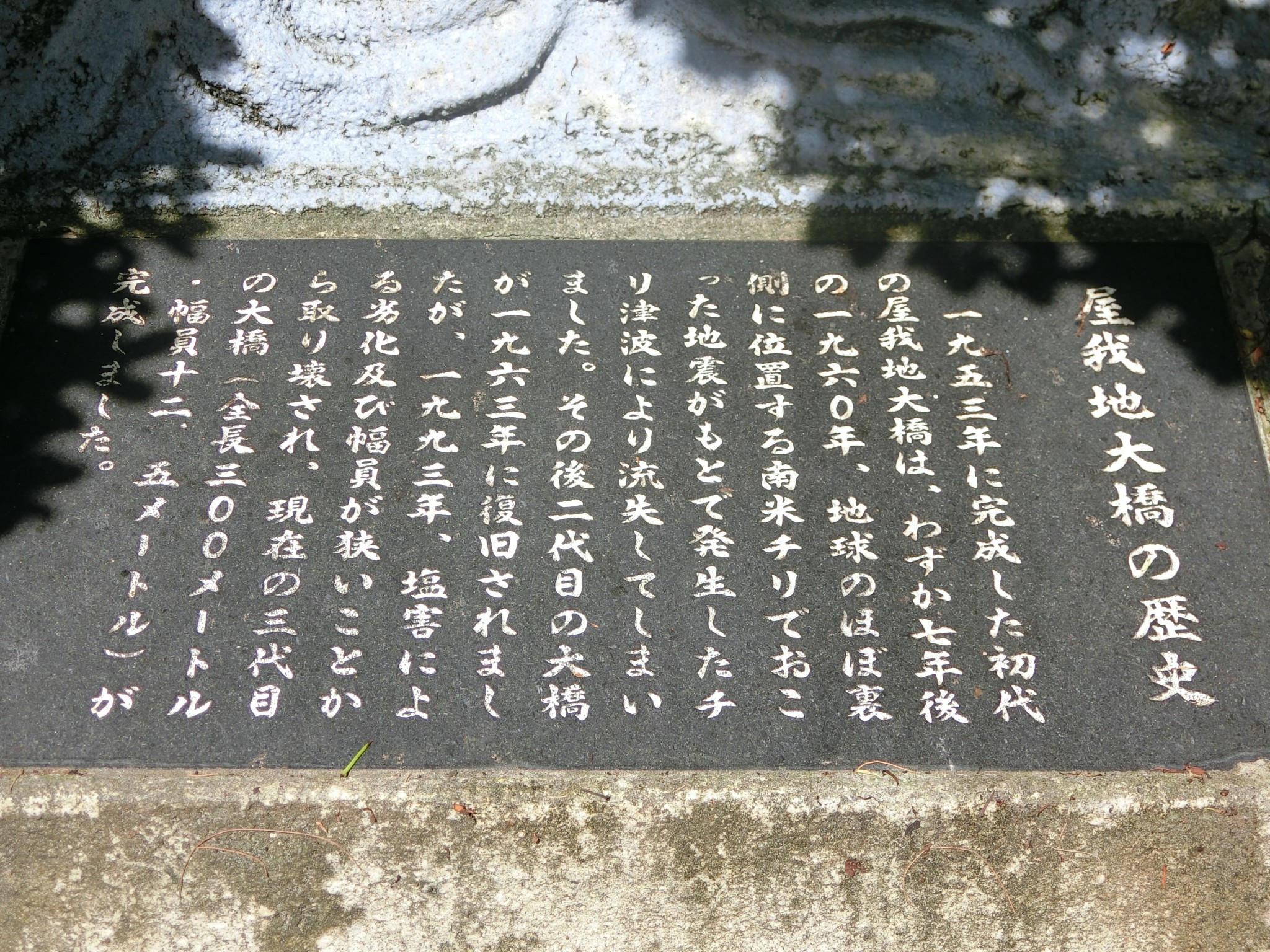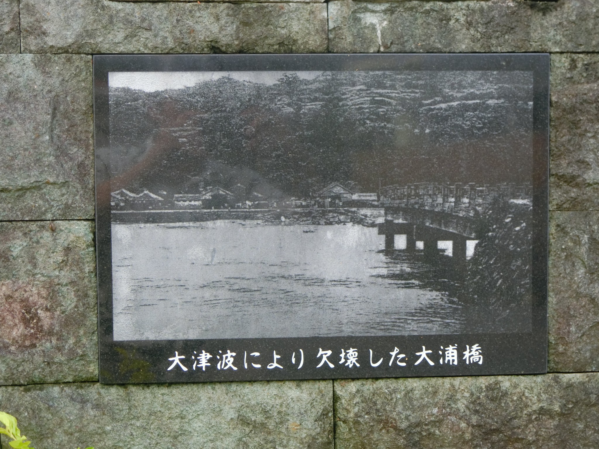 石碑には崩落した大浦橋の写真もはめ込まれ、伝承の工夫がなされている。