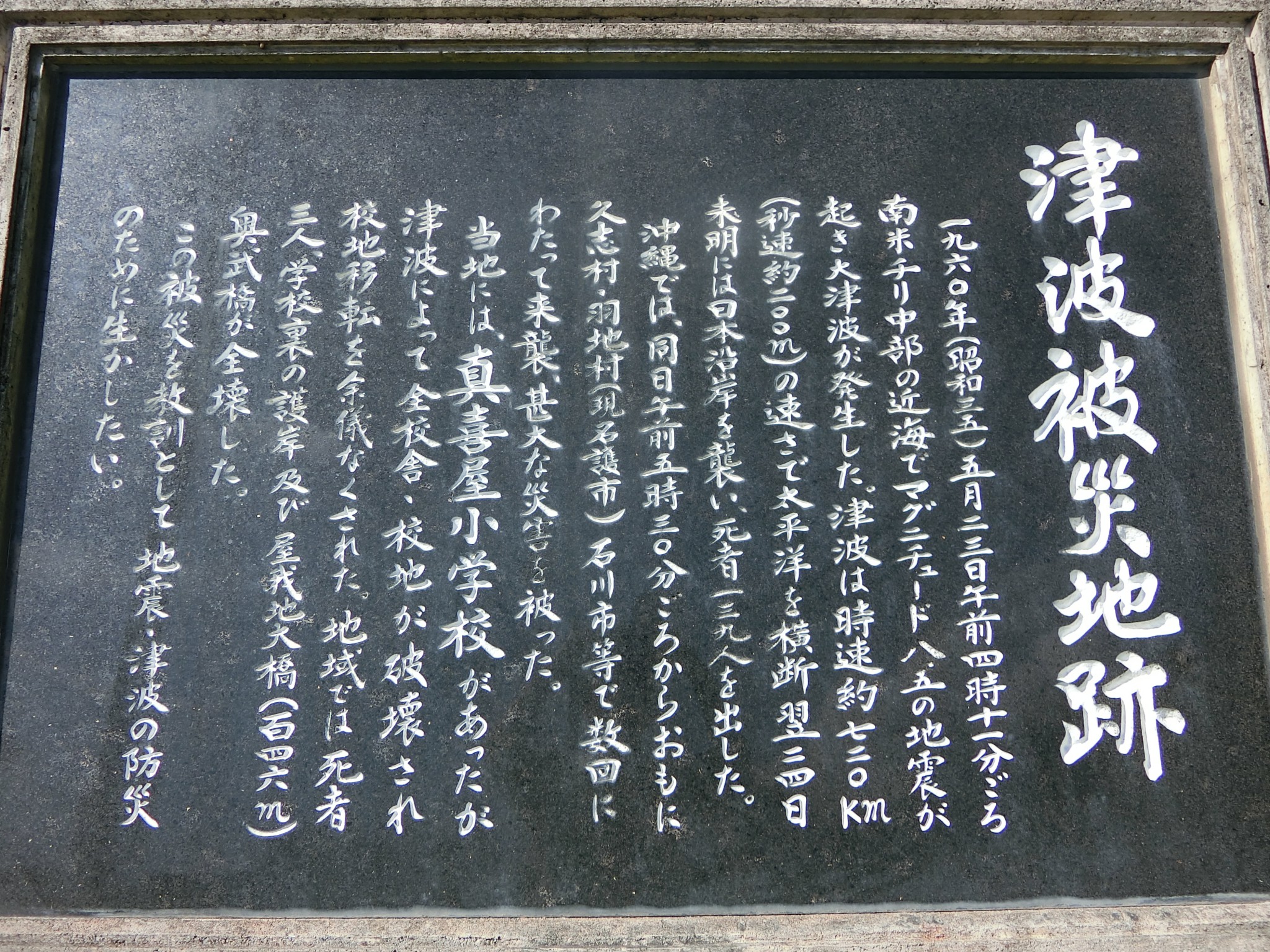 1960年(昭和35)5月23日午前4時11分ごろ南米チリ中部の近海でマグニチュード8.5の地震が起き大津波が発生した。津波は時速約750km(秒速約200m)の速さで太平洋を横断 翌24日未明には日本沿岸を襲い、死者139人を出した。