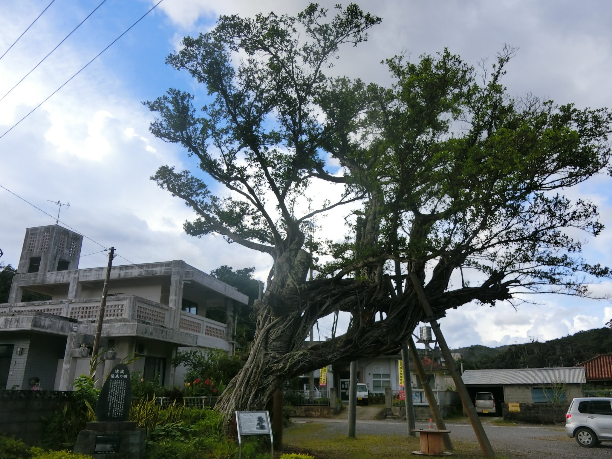 大浦区公民館前には、樹齢120年のガジュマルがあり、「大浦アサギ庭(みゃー)のガジマル」として名護市指定の天然記念物になっている。ガジュマルの近くにあり、戦争で一部が焼けながらも生き長らえた天然記念物「大浦のイチョウ」とともに、パワースポットとしても脚光を浴びているそうだ。
