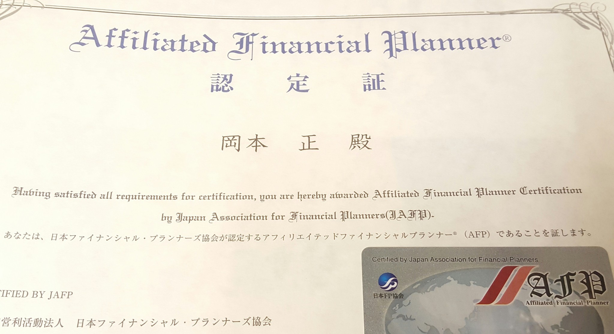 この度、2級ファイナンシャルプランナー技能士(2級FP技能士)試験に合格し、2016年11月1日付で、日本FP協会が認定するAFP(アフェリエイテッド・ファイナンシャル・プランナー)にも登録しました。