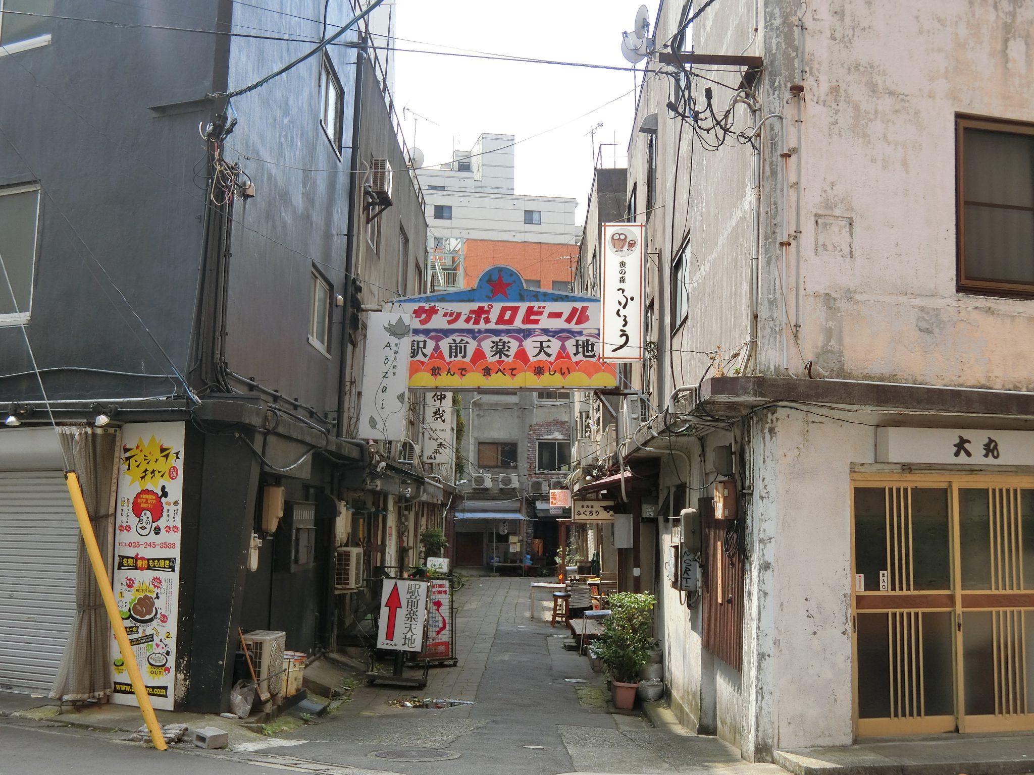 地震と液状化の影響を受けた建物は数多い。その中で誰でも訪れることができる場所が「駅前楽天地」。新潟駅万代口から徒歩5分ほどの昭和が残る飲み屋街。新潟の知人曰く、今でこそ楽天地の建物は酔っぱらって曲がって見える、などと冗談を言われるようである。しかし、液状化被害や地震の生々しい爪痕を現代に伝える遺構だったのだ。楽天地に続く細い路地も地盤沈下しているように見える。